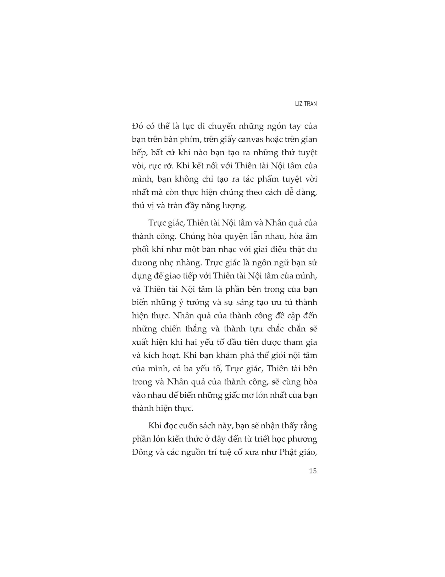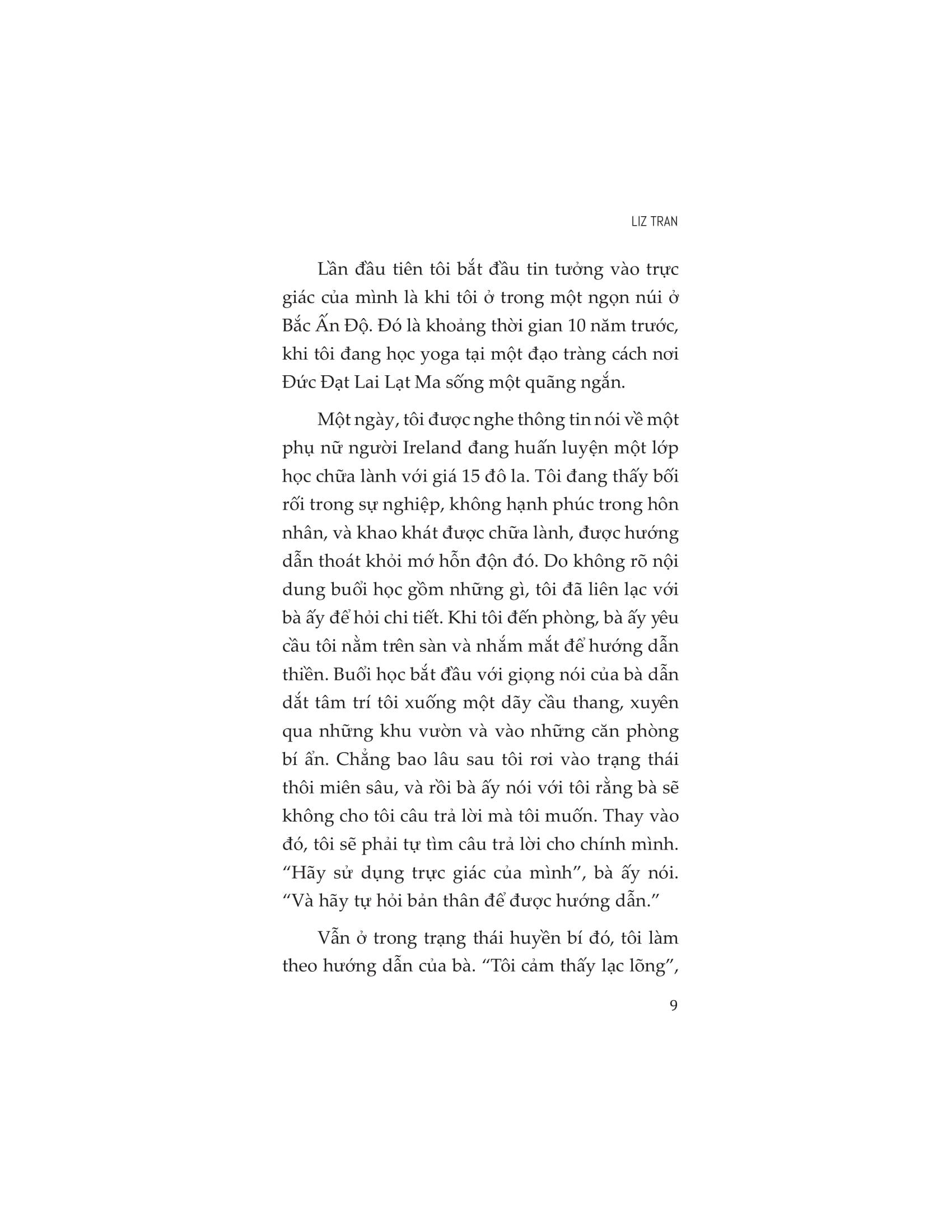 Tác giả Liz Tran – một huấn luyện viên kinh doanh, giám đốc công nghệ, người chữa lành Reiki, và nhà lãnh đạo tinh thần – sẽ chỉ cho bạn Bốn trụ cột của chiến lược tâm linh: hiểu rõ nội tâm, thực hành chánh niệm, nuôi dưỡng năng lượng, và tăng cường trí tuệ. Bên cạnh đó, bạn sẽ được truyền cảm hứng từ những câu chuyện về các nhà lãnh đạo và những cá nhân đã phát huy tối đa tiềm năng bằng cách sử dụng trực giác của họ.