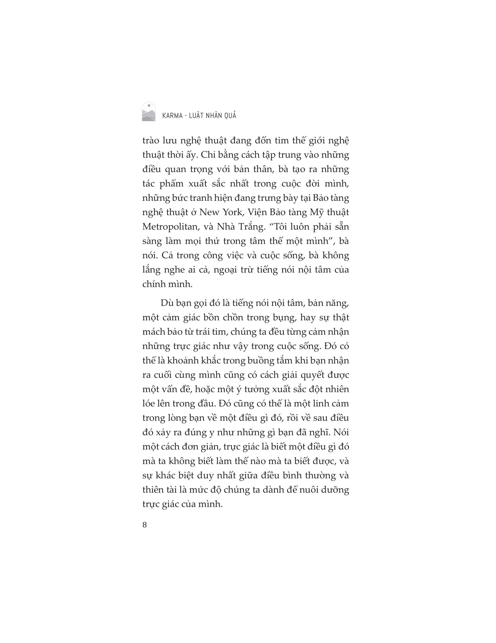 Cuốn sách ‘Karma – Luật nhân quả’ là một sự kết hợp của thế giới nội tâm, tâm linh với sự nghiệp cá nhân. Chỉ khi sự nghiệp và cuộc sống của bạn hòa hợp với những thứ bên trong con người bạn, nó mới tạo ra hành động và giá trị thực sự. Khi đạt được sự đồng nhất này, bạn sẽ tự tin hơn, có năng lực hơn và thành công theo cách riêng của m.ình. Thay vì chạy theo chuẩn mực xã hội, bạn sẽ học cách lắng nghe chính m.ình, từ bỏ việc sống theo mong đợi của người khác, và xác định lại thành công theo cách riêng.