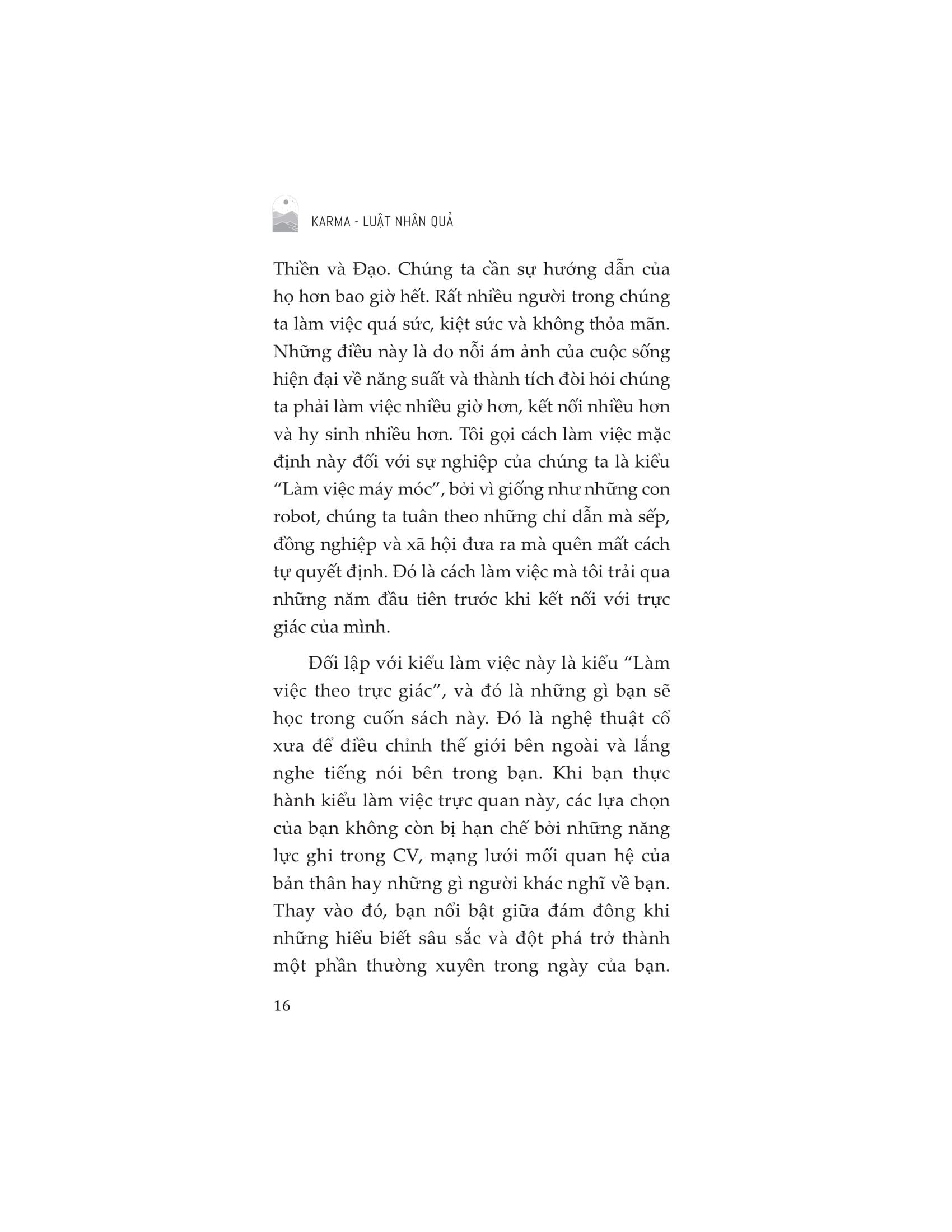 Mỗi người đều được sinh ra với một trực giác tự nhiên – điều mà Phật giáo gọi là "thấy Pháp" và Đạo giáo gọi là "tìm đường". Tuy nhiên, đa số chúng ta lại bị cuốn theo các dấu hiệu thành công bên ngoài như tiền bạc, địa vị và quyền lực. Điều này khiến tiếng nói bên trong bị lu mờ, dẫn đến việc ta không còn hiểu rõ m.ình thực sự là ai và khả năng của m.ình là gì.