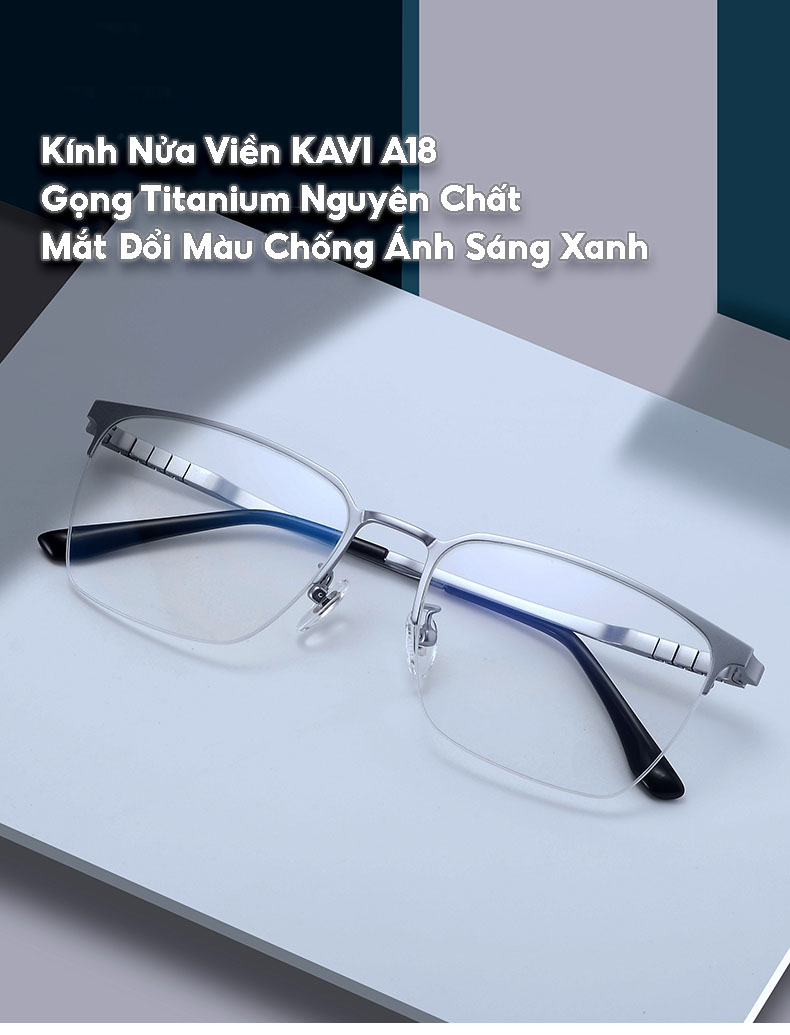KAVI A18 – Kính nửa viền gọng Titanium nguyên chất, đổi màu nhanh khi ra nắng và chống ánh sáng xanh, bảo vệ mắt toàn diện cả trong nhà và ngoài trời
