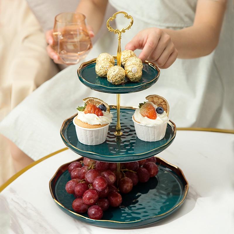 Mua tại TiktokKệ 2 - 3 tầng để bánh kẹo, hoa quả hoàng kim trắng viền vàng | Khay tầng sứ xanh cổ vịt cao cấp