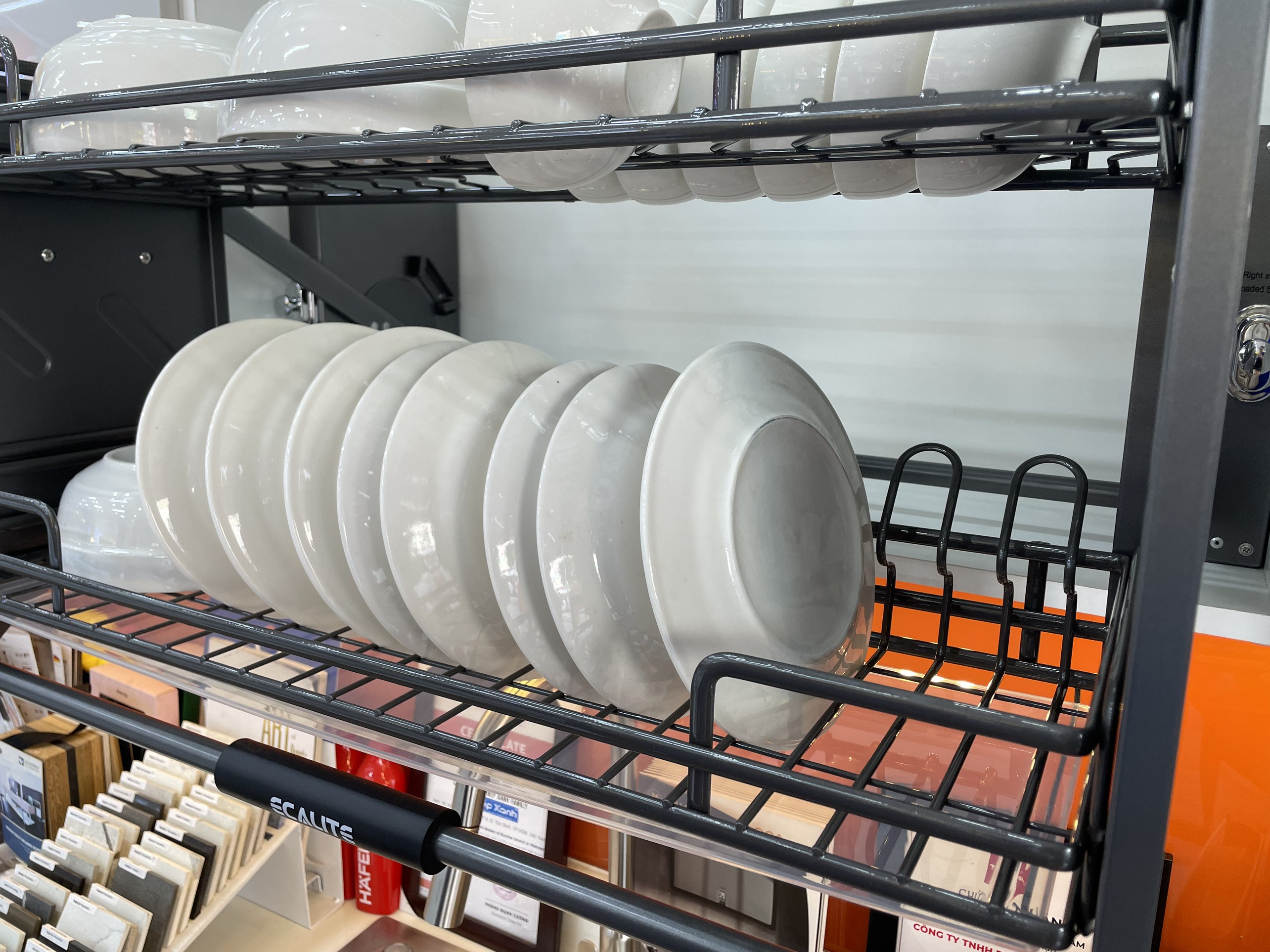 Khay đựng chén phía trên của kệ được chia thành các rãnh phù hợp với các loại chén bát thông thường trong gia đình Việt Nam.