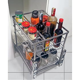Giá đa năng để giao thớt, chai lọ, gia vị Chất liệu: Inox 304 dạng nan tròn Phiên bản bắt cánh ngăn kéo và mở cánh Ray âm giảm chấn Angas Độ rộng cánh: 300mm