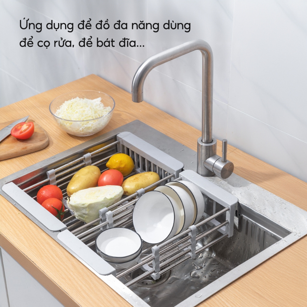 Kệ gác bồn rửa chán có thiết kế đặc biệt, thông minh và tiện dụng, có thể thay đổi kích thước chiều dài nên phù hợp với hầu hết các loại bồn rửa: Kích thước