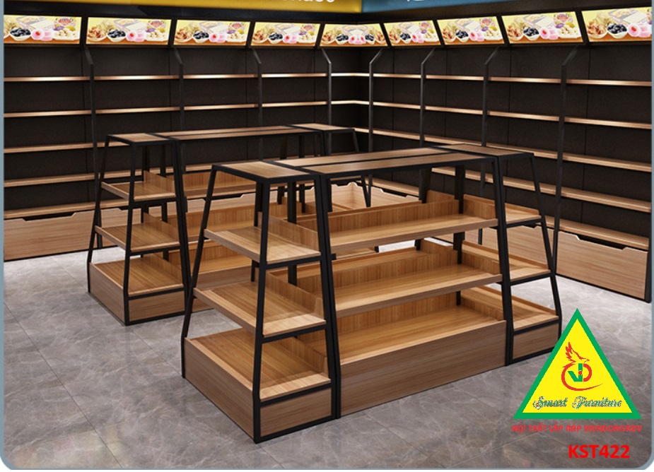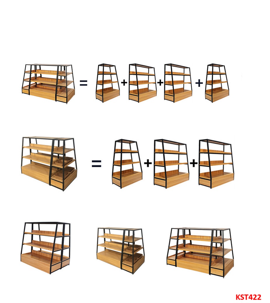 Kệ gỗ khung sắt trưng bày sản phẩm trong các cửa hàng trái cây, rau củ quả