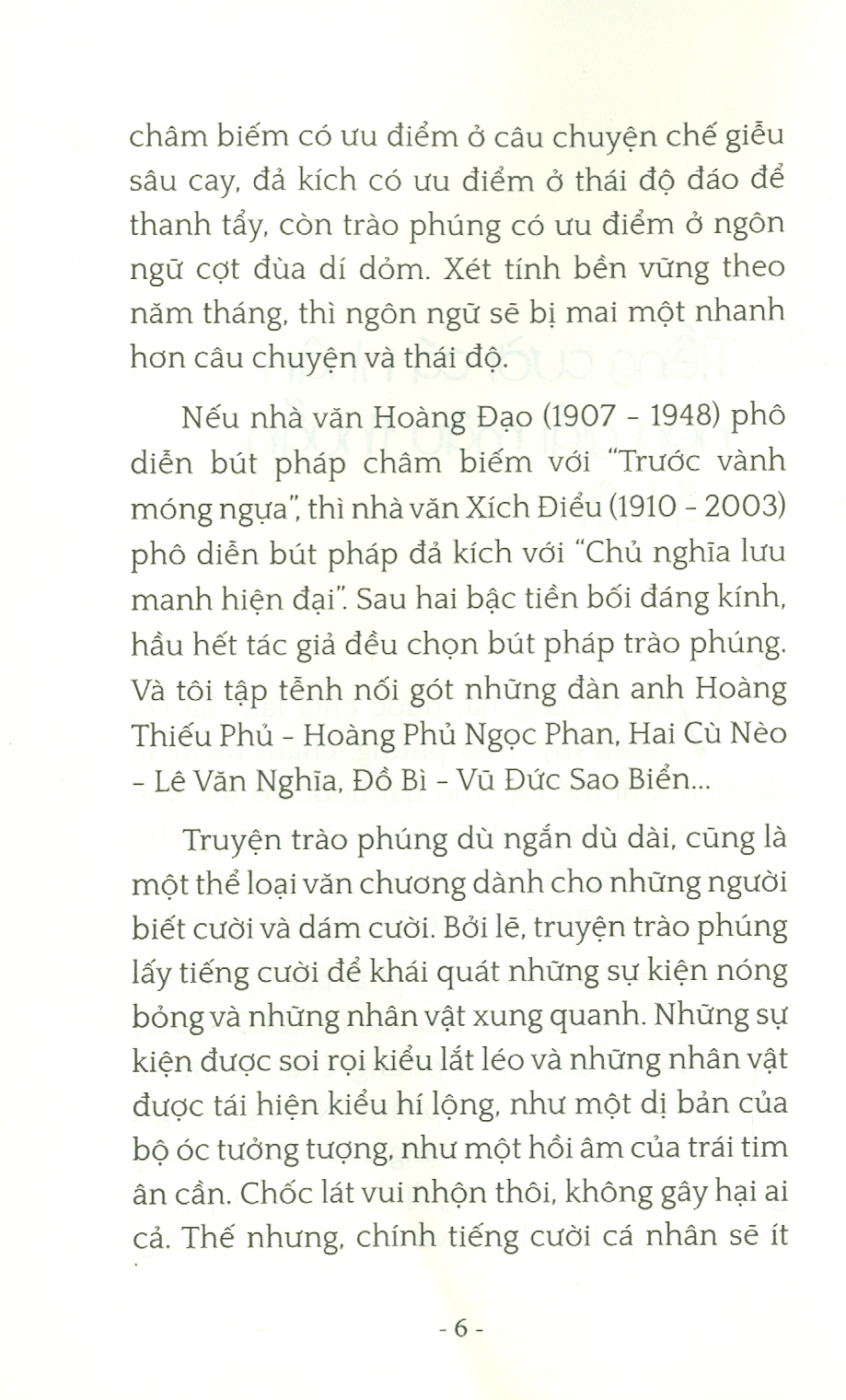 Truyện trào phúng dù ngăn dù dài, cũng là một thể loại văn chương dành cho những người biết cười và dám cười. Bởi lẽ, truyện trào phúng lấy tiếng cười để khái quát những sự kiện nóng bỏng và những nhân vật xung quanh. Những sự kiện được soi rọi kiểu lắt léo và những nhân vật được tái hiện kiểu hí lộng, như một dị bản của bộ óc tưởng tượng, như một hồi âm của trái tim ân cần. Chốc lát vui nhộn thôi, không gây hại ai cả. Thế nhưng, chính tiếng cười cá nhân sẽ ít nhiêu góp phần hóa giải mâu thuẫn xã hội, mà không cần bất kỳ hành động cụ thể nào.
