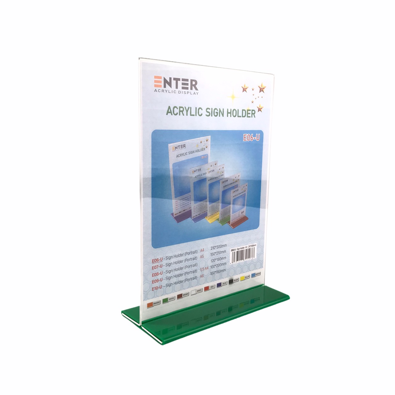 Kệ mica 2 mặt Enter để bàn là sản phẩm làm từ Mica Đài Loan, có công dụng trưng bày thực đơn, hiển thị giá cả sản phẩm tại các nhà hàng, khách sạn... sản phẩm này còn được dùng như một standee để bàn quảng cáo sản phẩm một cách ấn tượng nhất.