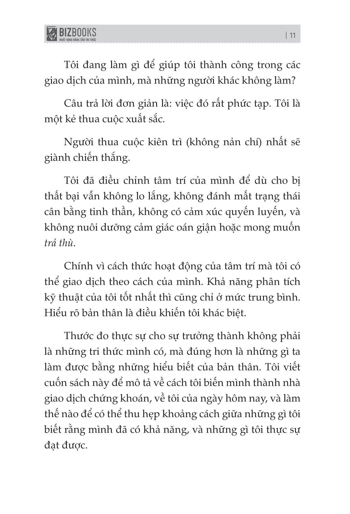 Cuốn sách mô tả cách chơi giao dịch, sự chuyển đổi để trở thành một nhà giao dịch nhất quán sẽ len lỏi vào cả các bình diện khác trong cuộc sống của bạn. Nó sẽ giúp bạn hiểu sâu về con người m.ình và những gì bạn có thể làm để cải thiện bản thân. Đích đến cuối cùng không chỉ là những con số tăng dần trên tài khoản giao dịch của bạn mà còn là một hành trình cuộc sống hài hoà, thú vị.