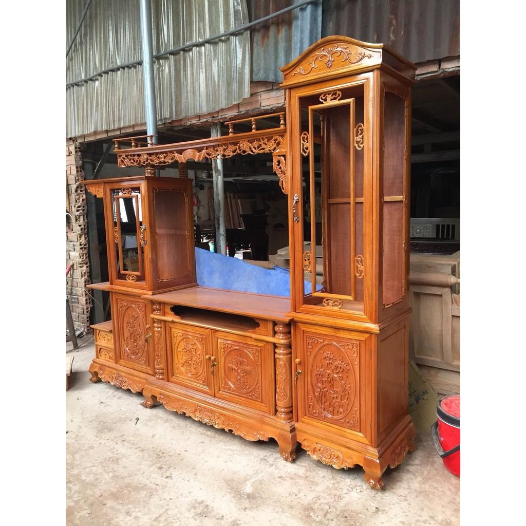 Kệ tivi kết hợp tủ rượu đôi gỗ gõ đỏ còn có các ngăn tủ để đặt đầu đĩa, âm ly phục vụ nhu cầu thưởng thức âm nhạc, hát karaoke của các gia đình.