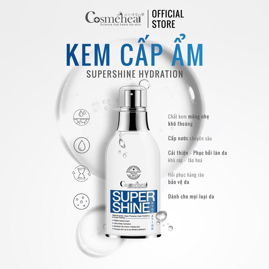 SUPERSHINE Hydration là dạng kem thân nước, với khả năng cấp ẩm chuyên sâu cho làn da, khôi phục mức cân bằng dầu/nước tự nhiên, ngăn ngừa mất nước xuyên biểu bì (TEWL), làm chậm quá trình lão hóa và giúp da căng bóng, khỏe mạnh. Kem phù hợp với mọi loại da, kể cả da dầu nhờ thể chất nhẹ, không gây nhờn rít và bít tắc lỗ chân lông.
