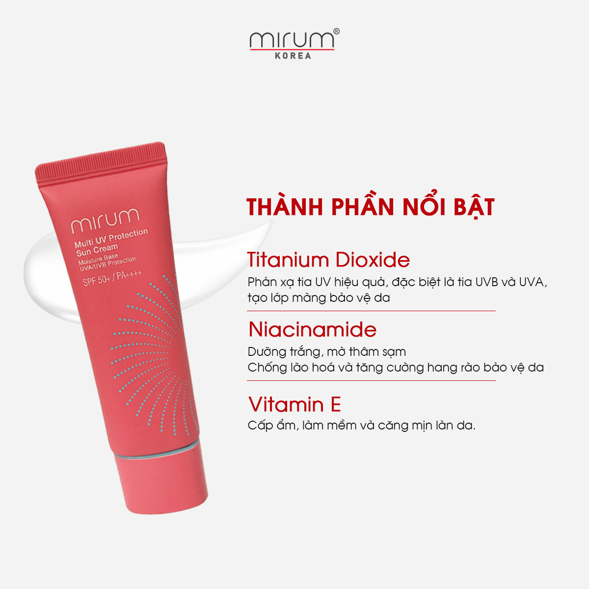 - Titanium Dioxide dưới dạng nano tăng cường bảo vệ da trước các tác nhân gây hại từ tia UVA, UVB ngăn ngừa tình trạng cháy da, sạm nám và lão hóa sớm, sản phẩm dễ tán, không để lại vệt trắng trên da.