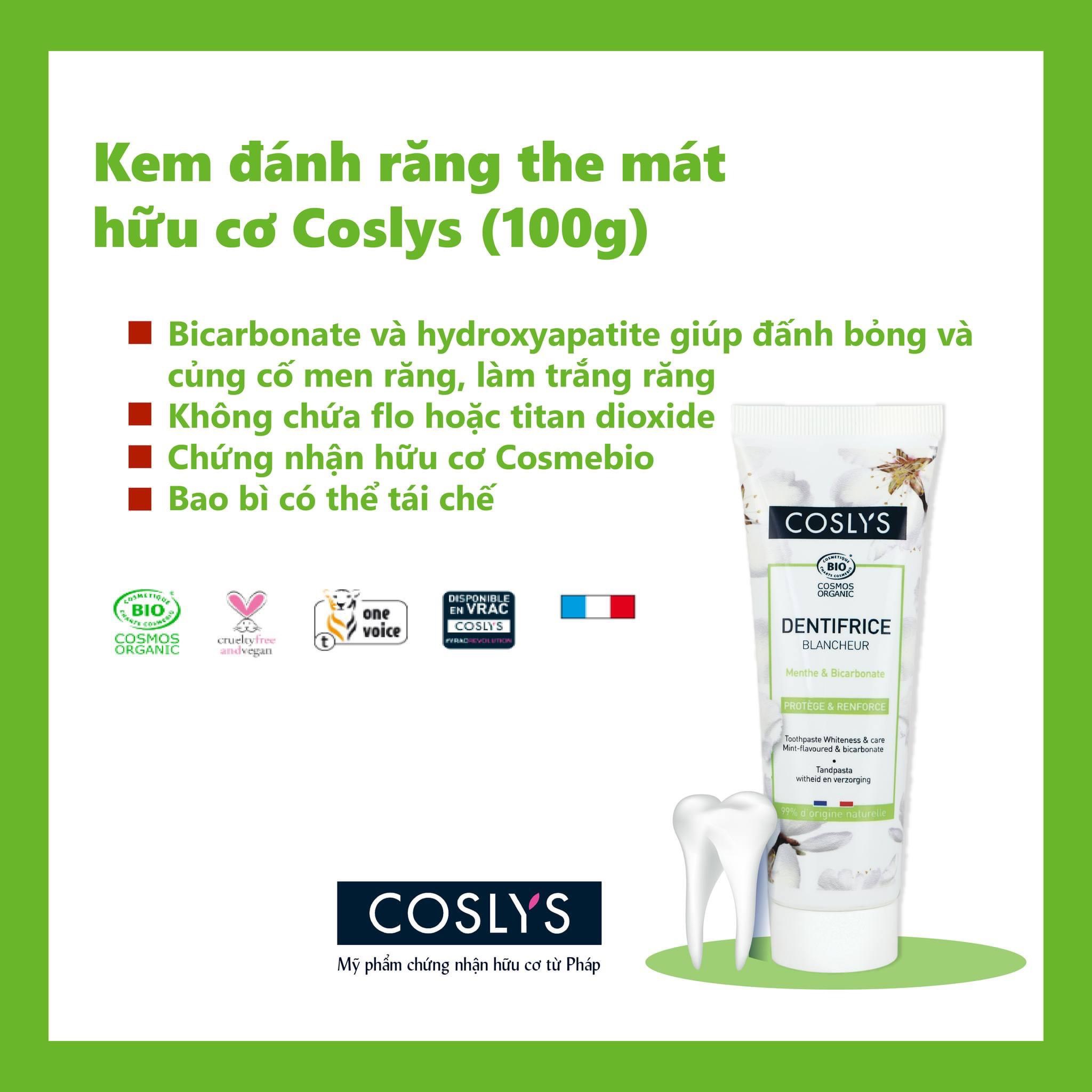 Chứng nhận hữu cơ Ecocert Chứng nhận Hữu cơ bởi Cosmos Organic ️Thương hiệu: Coslys - Pháp Kem đánh răng hữu cơ làm trắng răng hương hoa Coslys với mùi hương hoa cỏ ngọt, thành