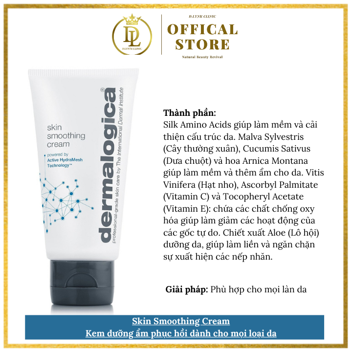 Mua tại TiktokKem dưỡng ẩm phục hồi da Dermalogica Skin Smoothing Cream với các chiếc xuất thảo dược làm dịu và Vitamin chống oxi hóa giúp duy trì cân bằng độ ẩm cho da đồng thời cải thiện cấu trúc giúp phục hồi sự săn chắc và tông màu da. Khi các lipid tự nhiên trong da bị mất đi, suy yếu hàng rào bảo vệ bề mặt da, do đó da mất khả năng giữ ẩm. Điều này đẩy nhanh quá trình mất độ ẩm ở da. Sự thiếu hụt các nhân tố giữ ẩm tự nhiên làm cho lớp tế bào da phía trên bị mất nước gây nên hiện tượng da thô ráp, kém sức sống. CÔNG DỤNG