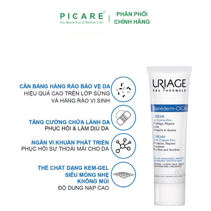 Mua tại TiktokUriage Bariederm Cica-Creme với phức hợp TLR2-Regul và nước khoáng Uriage làm dịu kích ứng tức thì, muối đồng kẽm nhanh chóng khử trùng, ngăn vi khuẩn phát triển, Silicates, Polydecenes, lô hội giúp bảo vệ da. Công thức duy trì 24h, không dính rít, không chứa hương liệu, chất bảo quản. – là nhà phân phối chính hãng của Uriage tại Việt Nam. Kem Dưỡng Cho Da Kích Ứng Uriage Bariederm Cica Creme 15ml