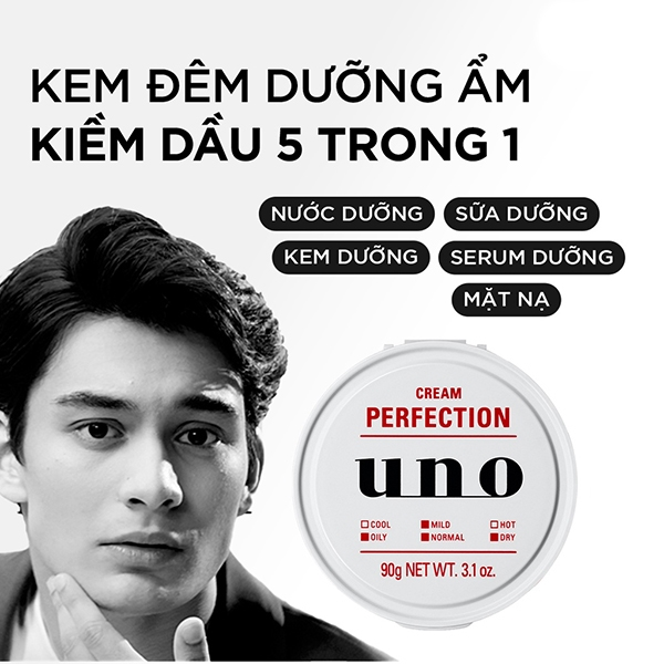 - Kem dưỡng ẩm là một sản phẩm tiện lợi và cần thiết cho làn da của cả nam lẫn nữ, giúp cấp ẩm, nuôi dưỡng, bảo vệ và giải quyết một số vấn đề của làn da. - Kem Dưỡng Ẩm Kiểm Soát Bã Nhờn Uno Cream Perfection là sản phẩm dành cho nam giới với 5 tác dụng trong 1 sản phẩm, sẽ giúp chăm sóc da toàn diện, đem lại làn da sáng mịn và tươi trẻ sau khi sử dụng. THÀNH PHẦN VÀ CÔNG DỤNG CHÍNH CỦA KEM DƯỠNG UNO: Kem Đêm Dưỡng Ẩm UNO Cream Perfection Kiềm Dầu 5in1: