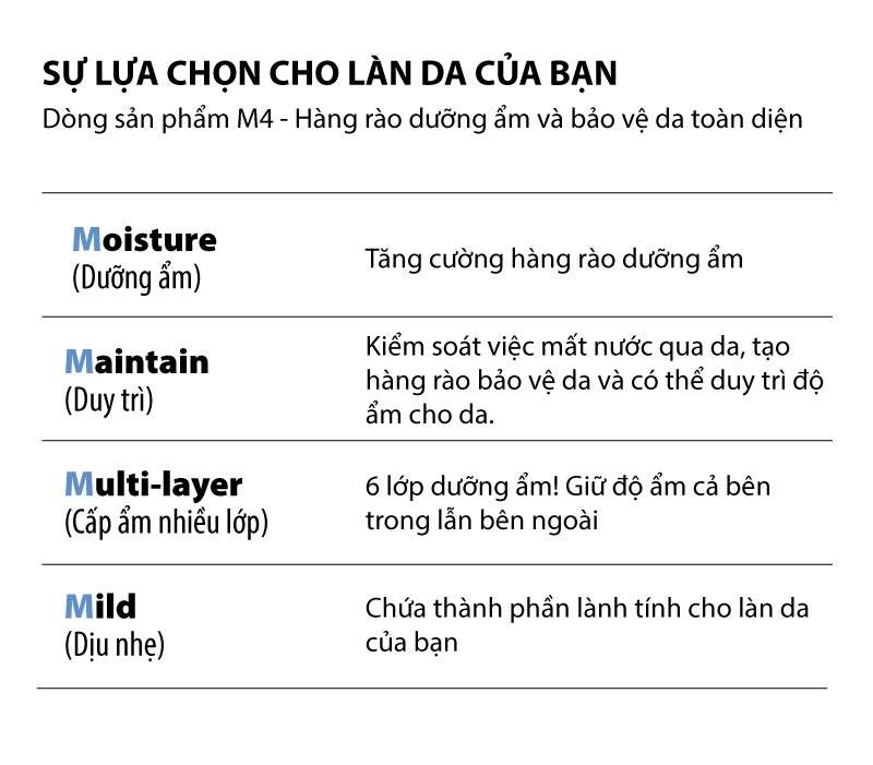 Làm sáng da. • HƯỚNG DẪN SỬ DỤNG Bước 1: Lấy một lượng kem dưỡng vừa đủ chấm đều 5 điểm trên mặt. Bước 2: Dùng ngón tay thoa đều khắp mặt sao cho kem dưỡng thấm đều và thẩm thấu nhanh vào da. Lưu ý: Nên sử dụng kem dưỡng 2 lần/ngày vào buổi sáng và tối, kết hợp trọn bộ Moist Barrier M4 để đạt hiệu quả dưỡng ẩm tối ưu. • THÔNG TIN SẢN PHẨM Xuất xứ thương hiệu: Hàn Quốc Nơi sản xuất: Hàn Quốc Ngày sản xuất: Xem trên bao bì sản phẩm Hạn sử dụng: 2 năm kể từ ngày sản xuất. **Bao bì thay đổi theo từng đợt nhập hàng