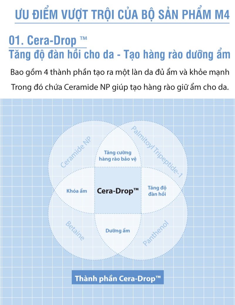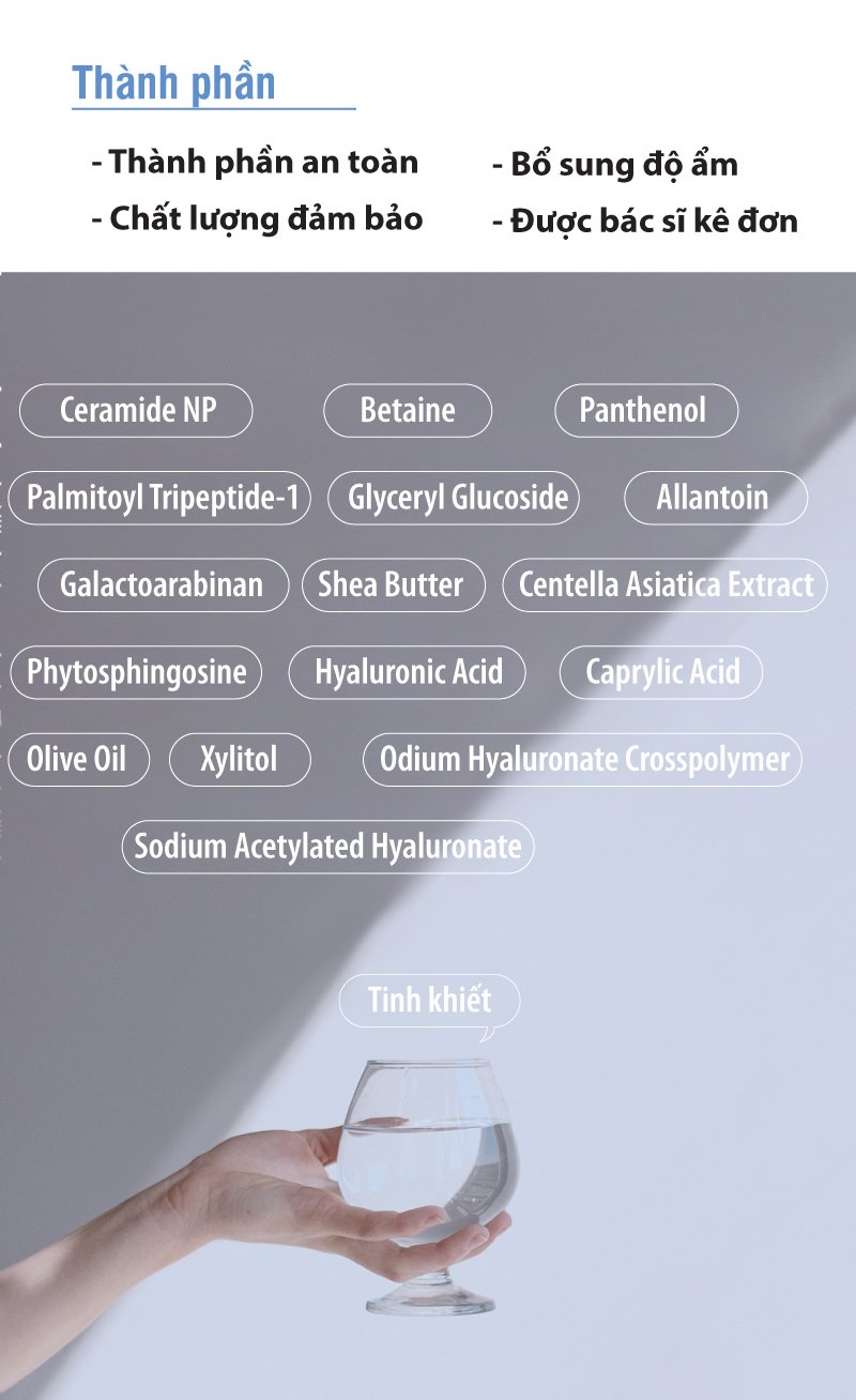 - Ứng dụng công thức Cera-drop độc quyền bao gồm 04 thành phần: Ceramide NP, Panthenol, Betaine, Palmitoyl Tripeptide-1 giúp củng cố và tăng cường hàng rào dưỡng ẩm cho da, giúp ngăn ngừa hiệu quả hiện tượng mất nước xuyên biểu bì giúp làn da luôn giữ được độ ẩm lý tưởng nhất