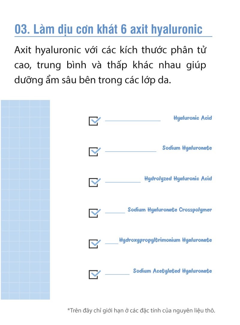 - Làm dịu cơn khát của làn da với 6 loại Acid Hyaluronic - thành phần vàng ưu việt giúp làn da ngậm nước căng mướt tức thì.
