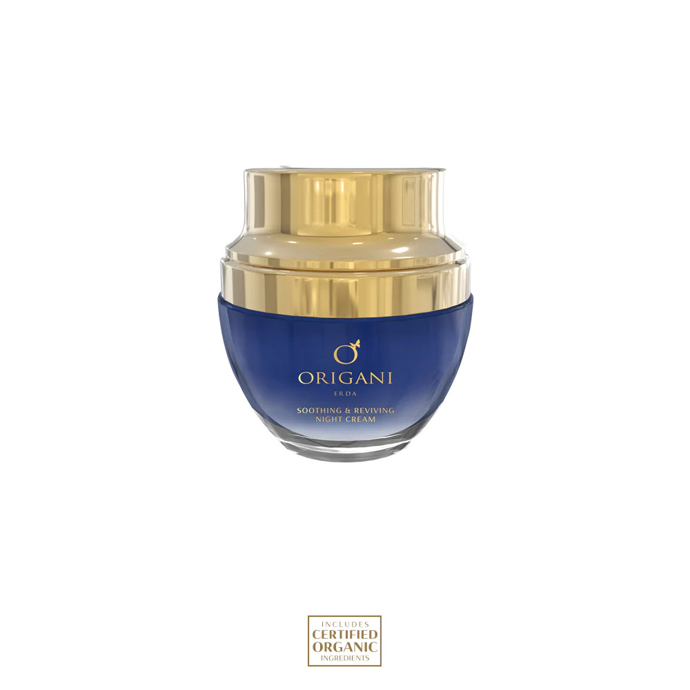 - Nhờ thế, mỗi thành phần của ORIGANI đều có tính TƯƠNG THÍCH SINH HỌC (Phẩm chất không có tác động độc hại hoặc gây tổn hại đến hệ sinh thái) mà khó các thương hiệu chăm sóc da cao cấp nào làm được. SOOTHING & REVIVING NIGHT CREAM (50ml) Origani Erda Soothing & Reviving Night Cream là sản phẩm lý tưởng để thư giãn và phục hồi làn da vào ban đêm. Được chiết xuất từ các thành phần thực vật tinh túy, sản phẩm chứa nhiều protein, vitamin và các loại dầu cao cấp. Lavender và Aloe Vera giúp giải độc và làm dịu da, trong khi Chiết xuất Hạt Nho và Dầu Olive cung cấp hỗ trợ chống oxy hóa vượt trội. Dùng mỗi ngày (tối): sau khi rửa mặt sạch, massage nhẹ nhàng vùng mặt, cổ và xương Các nguyên liệu chính