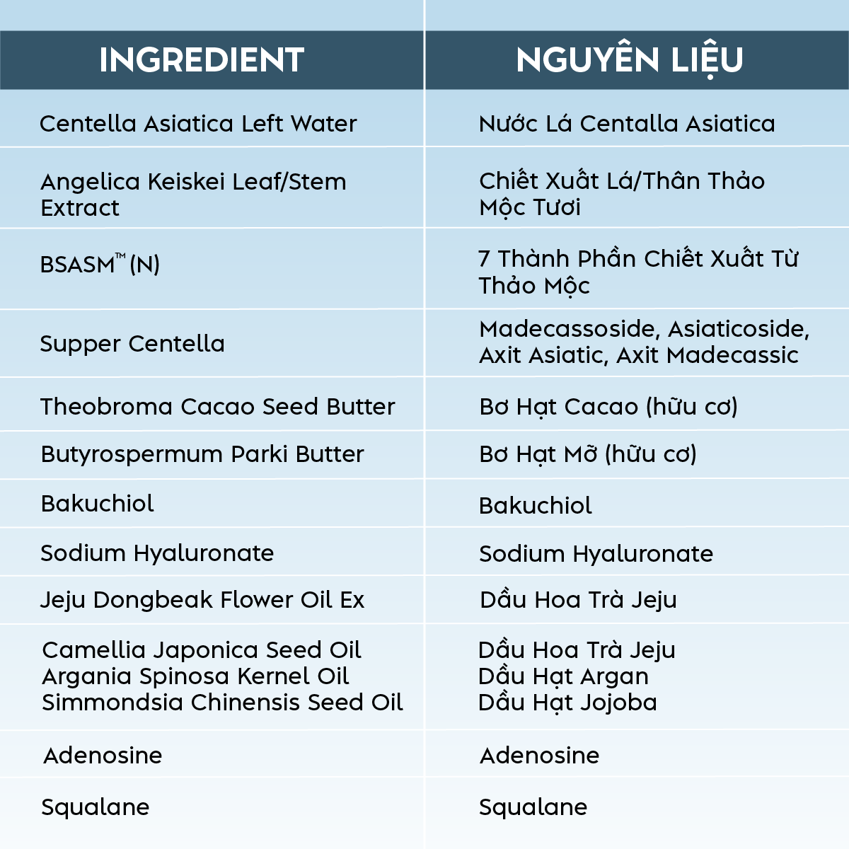 ● Hợp chất hoạt tính sinh học gồm Madecassoside, Asiaticoside, Axit Asiatic, Axit Madecassic: điều tiết bã nhờn, làm dịu, chống oxy hoá, ngăn ngừa lão hoá