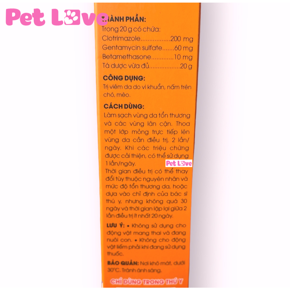 THÀNH PHẦN: Trong 1 g có chứa: Benzoyl mg Tá dược vừa đủ g CÔNG DỤNG: Trị viêm da cục bộ trên chó, mèo. CÁCH DÙNG: Viêm da, ghẻ, xà mâu. Thuốc có tác động