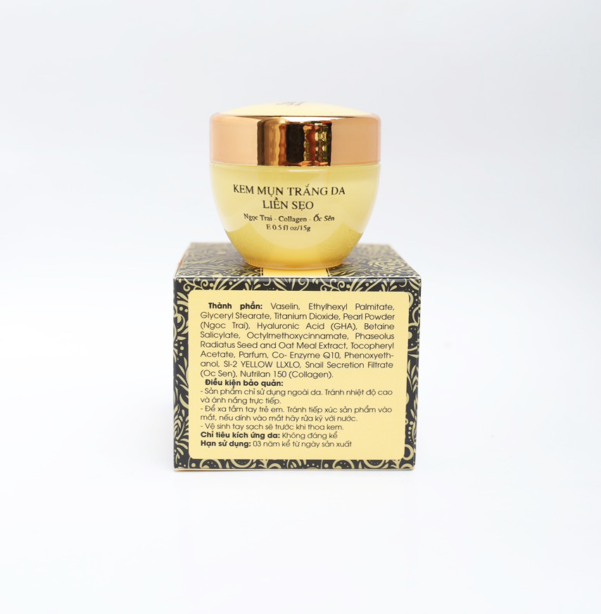 Mua tại TiktokVới tính chất từ Ngọc Trai, ốc sên và Collagen có tác dụng làm giảm các loại mụn: mụn trứng cá, mụn đầu đen, mụn bọc, mụn ẩn,…mà không để lại sẹo. Đồng thời làm se khít lỗ chân lông, giảm nhờn, làm mờ các vết sẹp do mụn để lại, bổ sung dưỡng chất cần thiết cho da, giúp da trắng hồng, mịn màng, không tỳ vết. Hướng dẫn sử dụng: Làm sạch da với nước hoặc sữa rửa mặt, lau khô da. Cho một lượng kem vừa đủ thoa nhẹ vùng da đang có mụn và khắp vùng mặt. Massage theo hình xoắn ốc cho kem nhanh thẩm thấu vào da. Lưu ý: Tránh thoa kem ở những vùng da có vết thương hở.