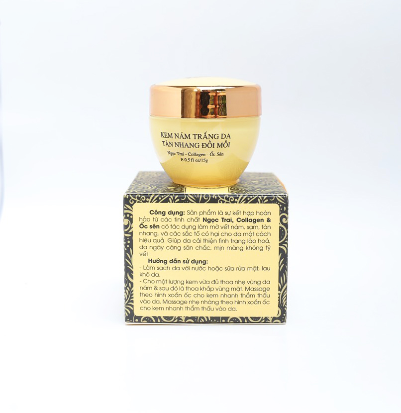 Sản phẩm là sự kết hợp hoàn toàn từ các tinh chất Ngọc trai, collagen và ốc sên có tác dụng làm mờ vết nám, sạm, tàn nhang, và các sắc tố có hại cho da một cách hiệu quả. Giúp da cải thiện tình trạng lão hóa, da ngày càng săn chắc, mịn màng không tỳ vết. Hướng dẫn sử dụng: Làm sạch da với nước hoặc sữa rửa mặt, lau khô da. Cho một lượng kem vừa đủ thoa nhẹ vùng da đang có mụn và khắp vùng mặt. Massage theo hình xoắn ốc cho kem nhanh thẩm thấu vào da. Lưu ý: Tránh thoa kem ở những vùng da có vết thương hở.