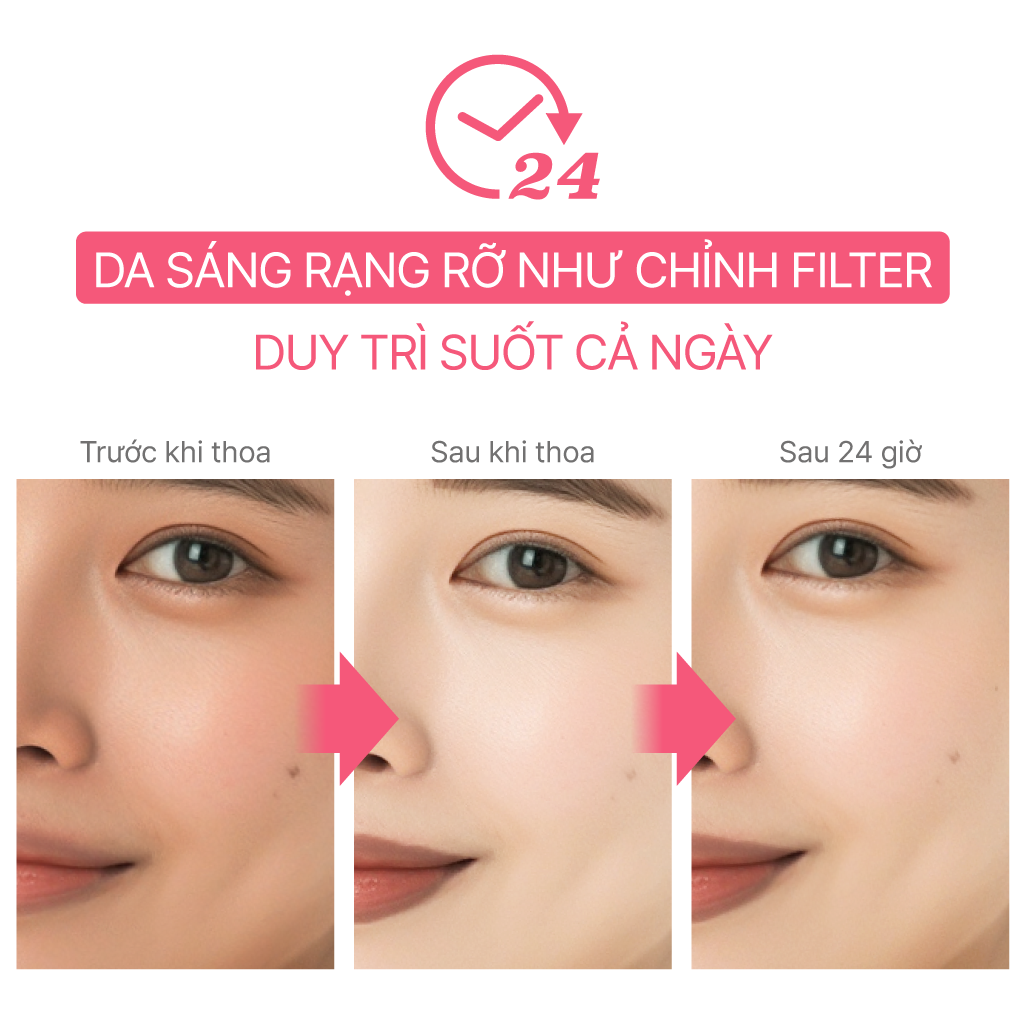 - Sử dụng trước các sự kiện đặc biệt hoặc đi chơi hàng ngày để duy trì làn da tươi sáng và rạng rỡ suốt cả ngày dài! Được đề xuất cho