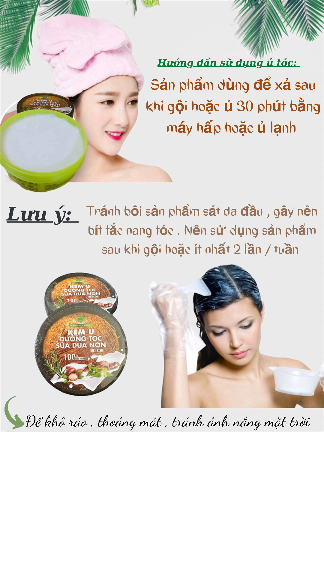 - Sản phẩm dùng để xả sau khi gội hoặc ủ 30 phút bằng máy hấp hoặc ủ lạnh . Tránh bôi sản phẩm sát da đầu , gây nên bít tắc nang tóc . Nên sử dụng sản phẩm sau khi gội hoặc ít nhất 2 lần / tuần . Thích hợp trong hệ thống gội đầu hoặc Spa dưỡng sinh vì sản phẩm được chiết xuất hoàn toàn từ thảo mộc . Bảo quản : Để khô ráo , thoáng mát , tránh ánh nắng mặt trời . Hạn sử dụng : 2 Năm kể từ ngày sản xuất