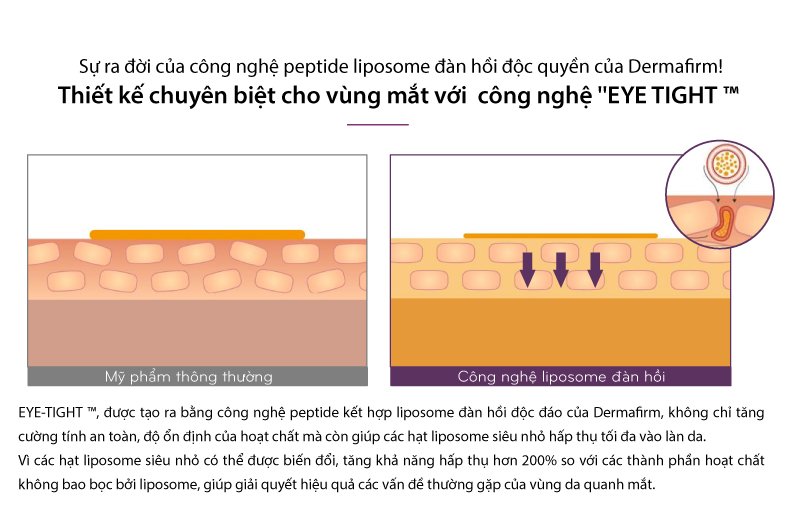 - EYE-TIGHT : Peptide độ tinh khiết cao tự sản xuất của Dermafirm áp dụng công nghệ liposome đàn hồi được hấp thụ tốt, tạo ra hiệu quả nhanh hơn và tức thì hơn để cải thiện quầng thâm và quầng mắt và độ đàn hồi. EYE-TIGHT có thể tăng khả năng hấp thụ hơn 200% so với các thành phần hoạt chất không bao bọc bởi liposome, giúp giải quyết các vấn đề về da quanh mắt nhanh chóng hơn.