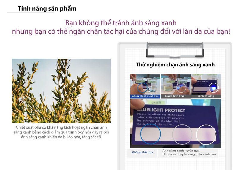 - Chiết xuất ô liu có khả năng kích hoạt ngăn chặn ánh sáng xanh.