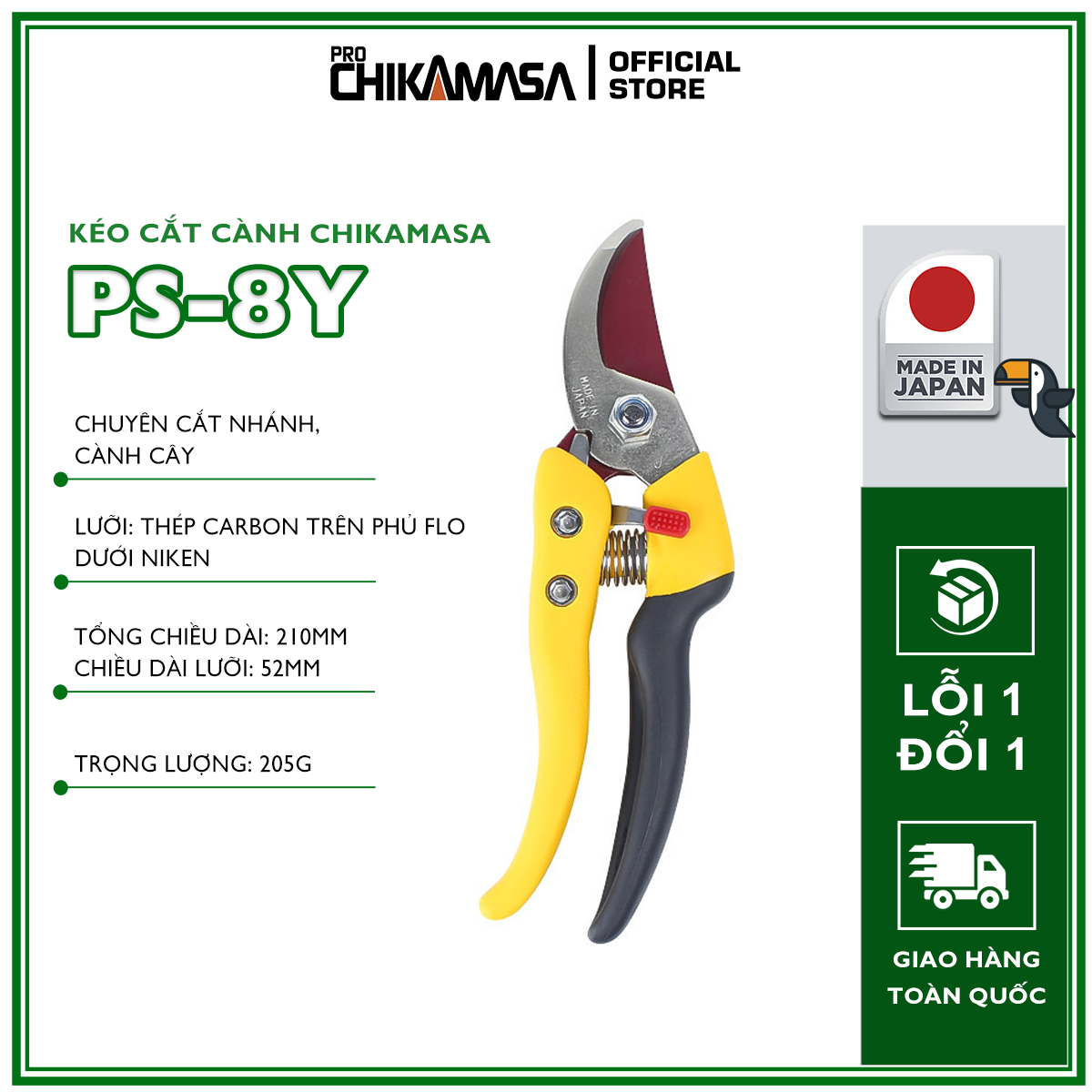 Kéo cắt cành Chikamasa PSN-8G Tổng chiều dài: 210mm. Chiều dài lưỡi: 52mm Trọng lượng: 205g Lưỡi: thép carbon trên phù Flo, dưới Niken Xuất xứ: Japan