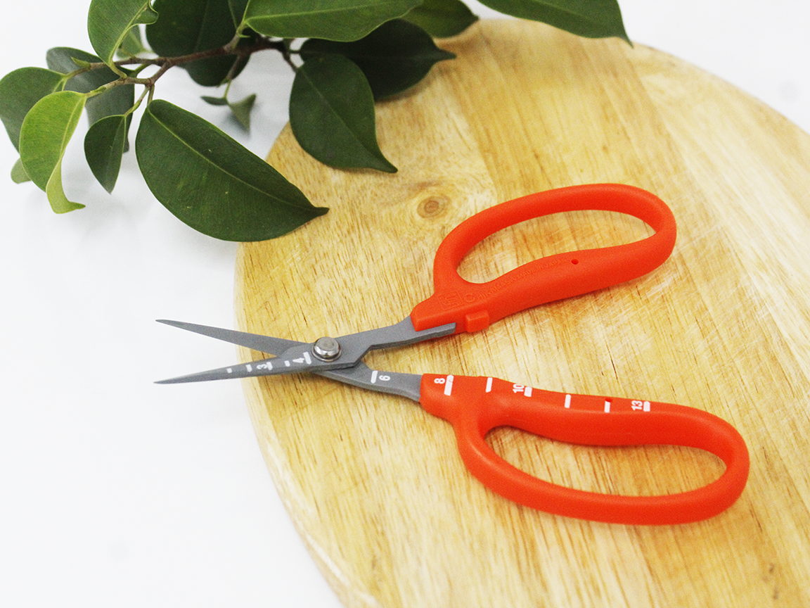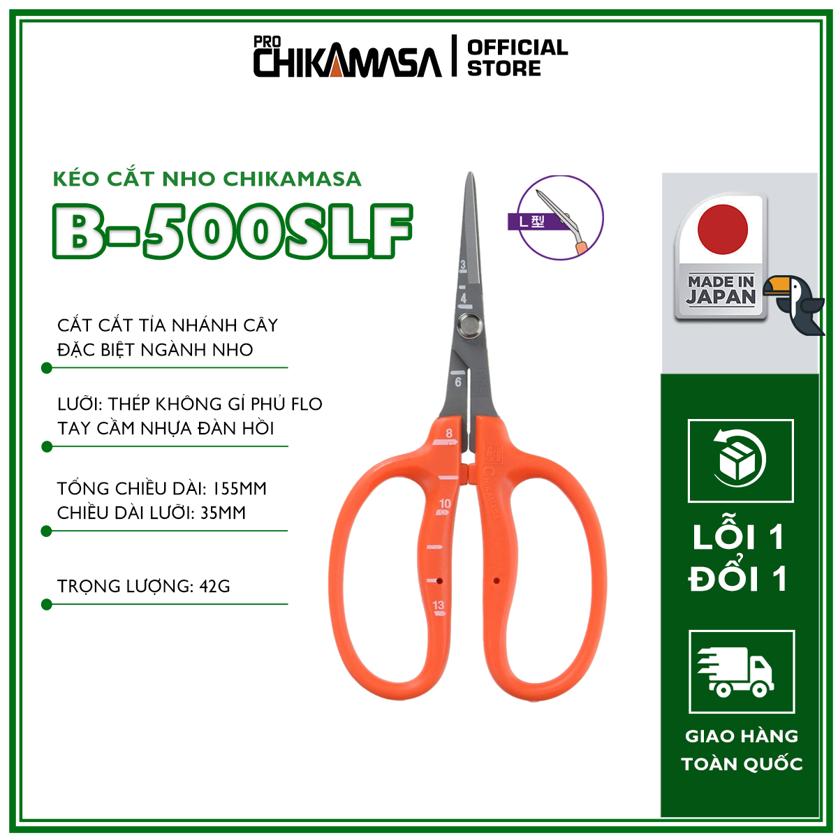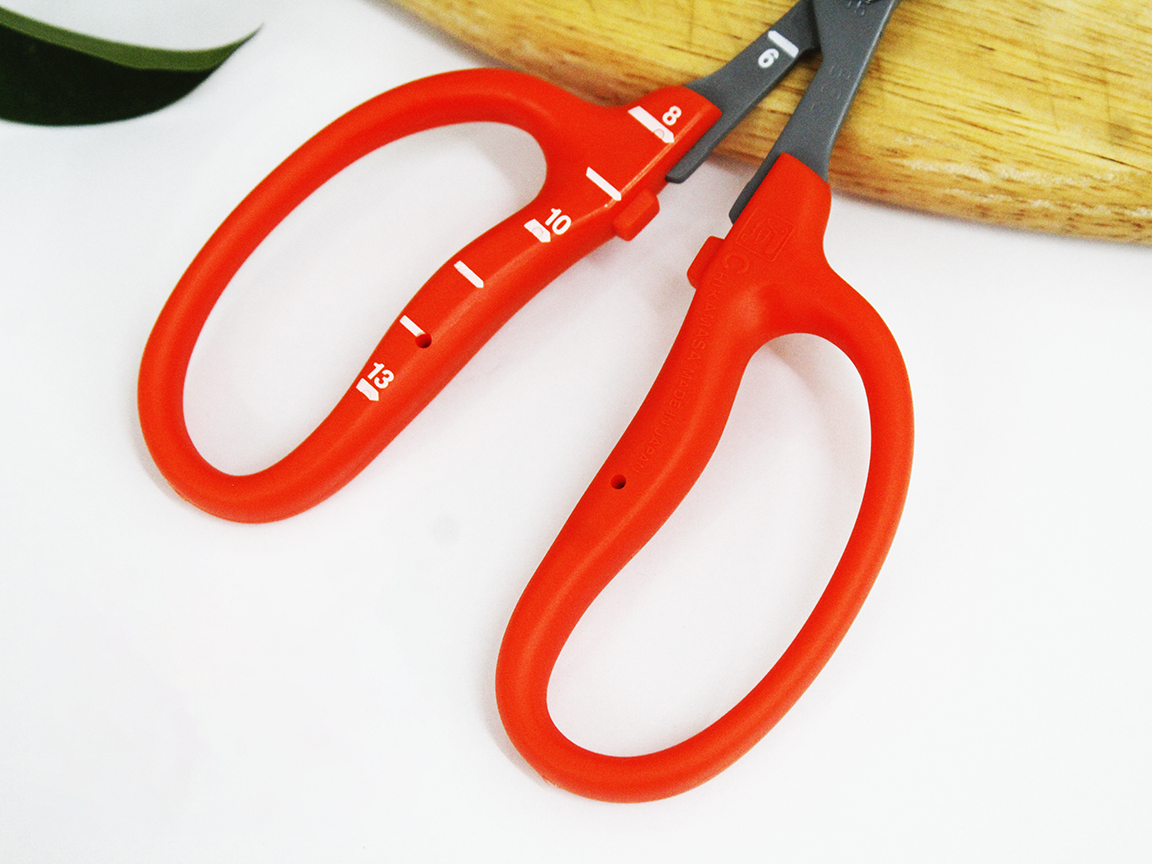 - Nét đẹp và độ tỉ mỉ của kéo cắt nho Nhật Bản Kéo cắt nho Chikamasa là bộ sưu tập thú vị cho chị em thích những chiếc kéo xinh xắn và có độ bén cao. Chikamasa B-500SLF là loại kéo dài nhỏ được làm bằng thép không gỉ phủ Flo, lưỡi cắt đi qua nhau như kéo cắt giấy quen thuộc. Mặt cắt phẳng phiu được mài bằng kỹ thuật tiên tiến cho độ sắc ấn tượng, cắt bén ngọt, sạch sẽ cành hoa, nhánh lá và hoa trái. Tay cầm ABS trên dưới làm rộng và đều nhau xỏ vừa các ngón tay và giúp chị em giữ kéo ngay ngắn. Ngoài ra, dòng kéo này có thiết kế phần lưỡi cong chữ L cực kỳ chuyên dụng. Được chế tạo theo kỹ thuật người Nhật, kéo cắt nho Chikamasa thống nhất và khớp tuyệt đối giữa tay cầm và lưỡi cắt. Khi cầm nắm không có cảm giác lỏng lẻo hay tiếng rít ở chỗ tiếp xúc, nhờ đó thao tác cắt tỉa rất êm ái nhẹ nhàng. Lưỡi cắt chống gỉ sét tuyệt đối cùng tay cầm cứng cáp, vừa vặn với đôi bàn tay xinh xắn bé nhỏ của chị em phụ nữ. Đặc biệt dòng sản phẩm này có thiết kế thêm vạch đo giúp bạn ước lượng được kích cỡ chùm nho nhanh chóng.