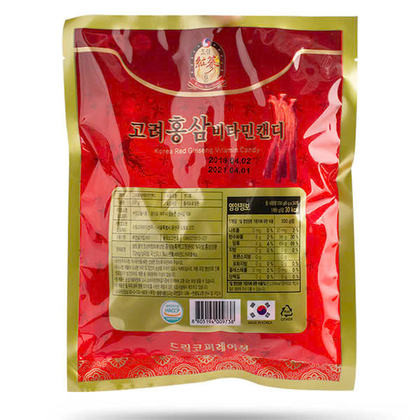 THÔNG TIN SẢN PHẨM Tên sản phẩm: Kẹo Hồng Sâm Vitamin Hàn Quốc 200g Thành Phần: tinh chất hồng sâm Hàn Quốc (cô đặc 60%, hàm lượng saponin 70mg/g) chiếm 0,1%, Vitamin C chiếm 0,012%,
