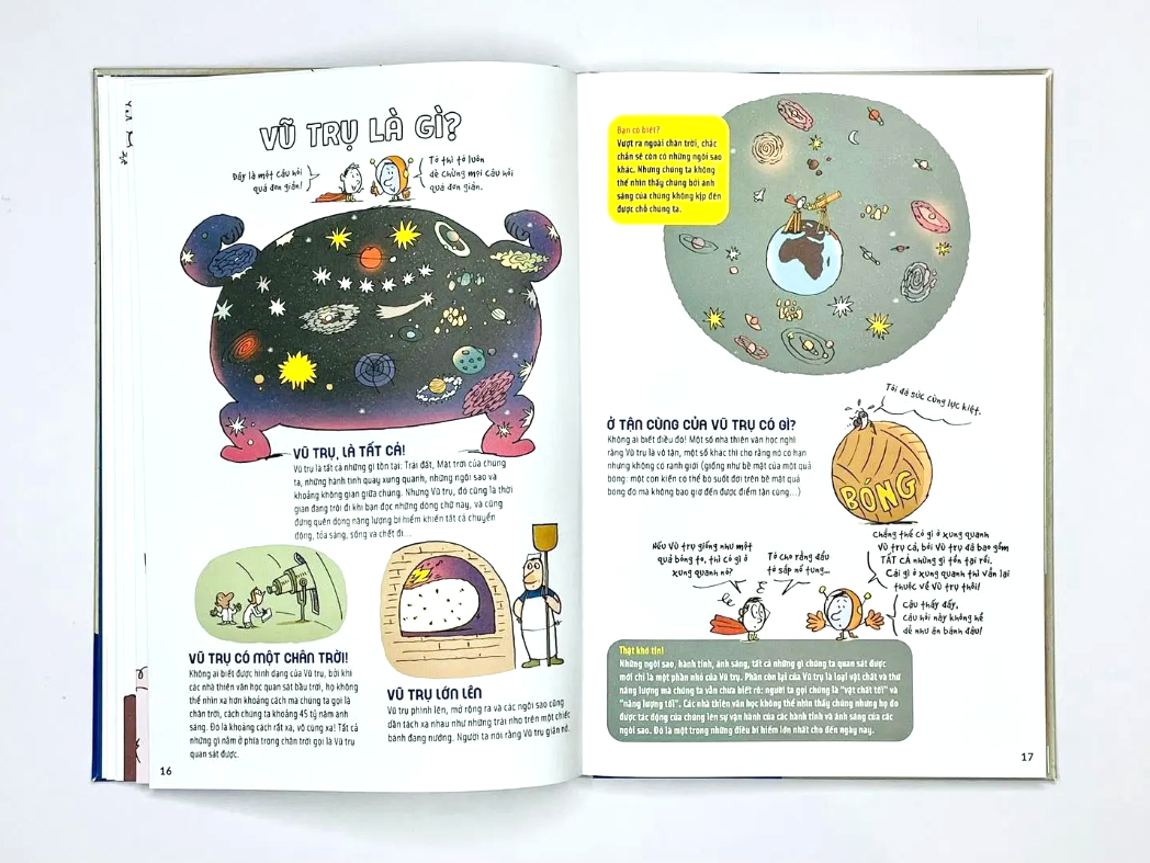 Vũ trụ là gì? Các hành tinh có tròn xoe không? E = mc2 có nghĩa là gì? Cuốn sách này trả lời rất nhiều câu hỏi mà chúng ta, bất kể là trẻ con hay người lớn, đều đặt ra về vị trí của Trái Đất trong Vũ trụ, về vụ nổ big bang, về nguồn gốc của các ngôi sao, về những hố đen hay các cuộc chinh phục không Những câu trả lời rất dễ hiểu đến từ một nhà báo khoa học kèm theo hình minh họa siêu dễ thuong của Pascal Lemaitre sẽ giúp độc giả hiểu thêm về lịch sử đáng kinh ngạc và bí hiểm thăm thẳm của Vũ trụ nơi chúng ta đang sống.