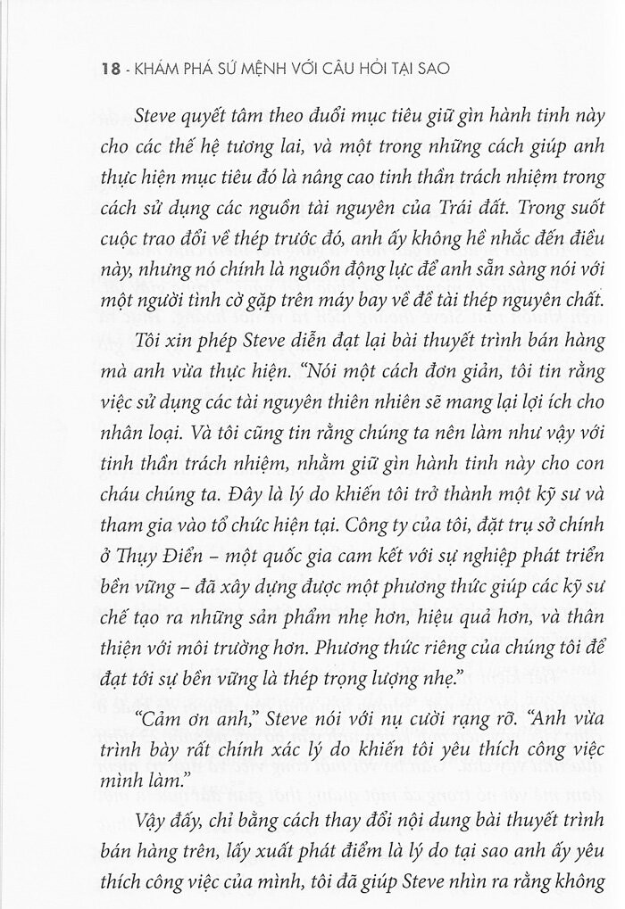 Nếu bạn là một nhân viên, giống như Steve, người bán loại thép siêu nhẹ ngồi cạnh Peter trong chuyến bay, thì việc hiểu rõ hai chữ TẠI SAO của bản thân sẽ giúp bạn làm mới lại niềm đam mê của mình và kết nối bạn với hai chữ TẠI SAO của công ty. Và trong trường hợp bạn và công ty đó phải chia tay nhau, thì việc hiểu rõ hai chữ TẠI SAO của bản thân sẽ là công cụ đắc lực để bạn lựa chọn công việc tiếp theo phù hợp với mình: một công ty nơi bạn “phù hợp” hơn, có khả năng thành công cao hơn và cảm thấy mãn nguyện hơn.