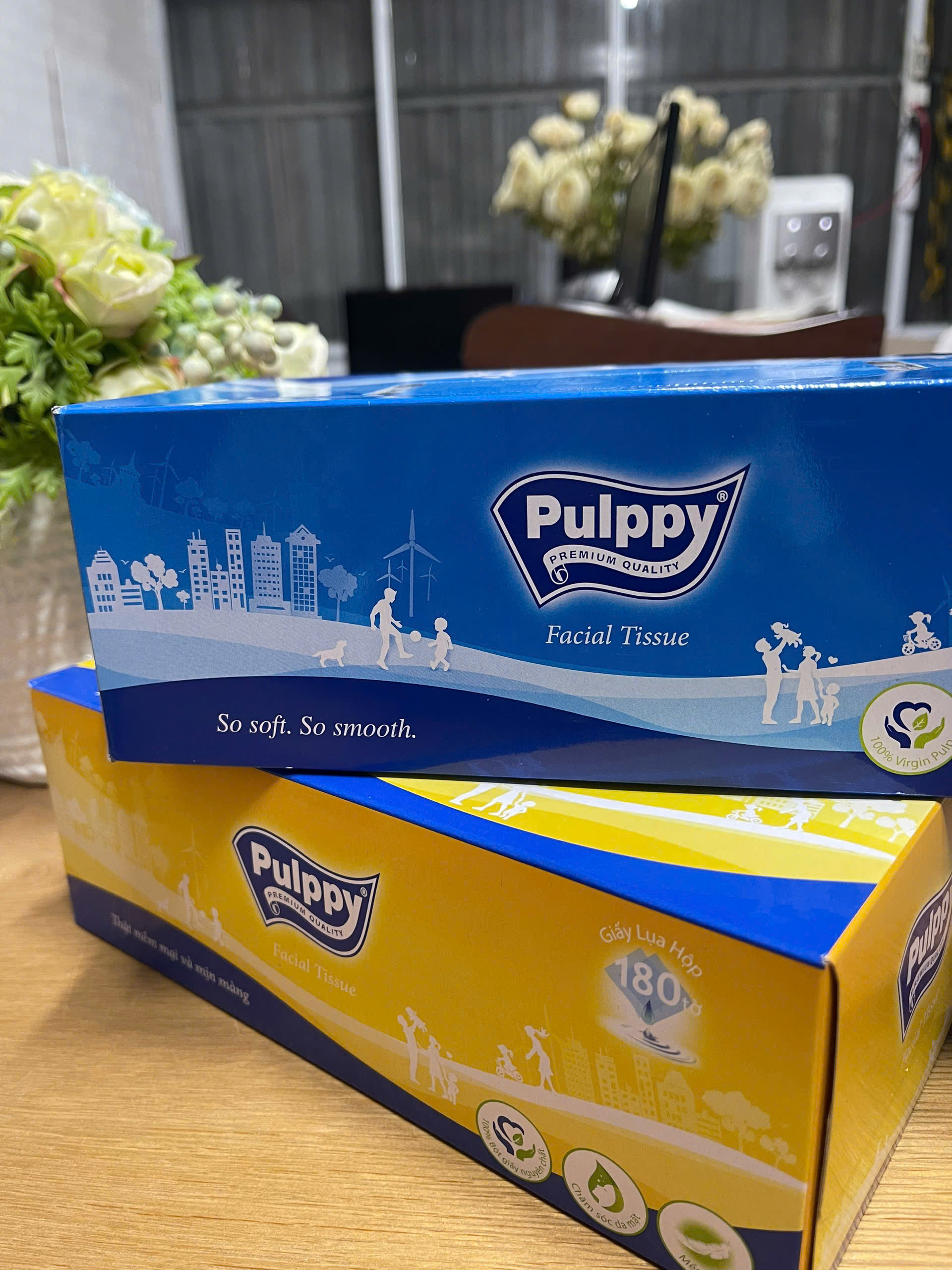 Giấy hộp Pulppy là sản phẩm phổ biến trong các hộ gia đình hay văn phòng bởi sự tiện ích với thiết kế hộp giấy tiện dụng, dễ dàng lấy từng tờ giấy giúp giấy luôn sạch sẽ và dễ dàng bảo quản. Được sản xuất với kỹ thuật ép hoa văn tiên tiến nhất mang lại cảm giác thoải mái khi dùng.