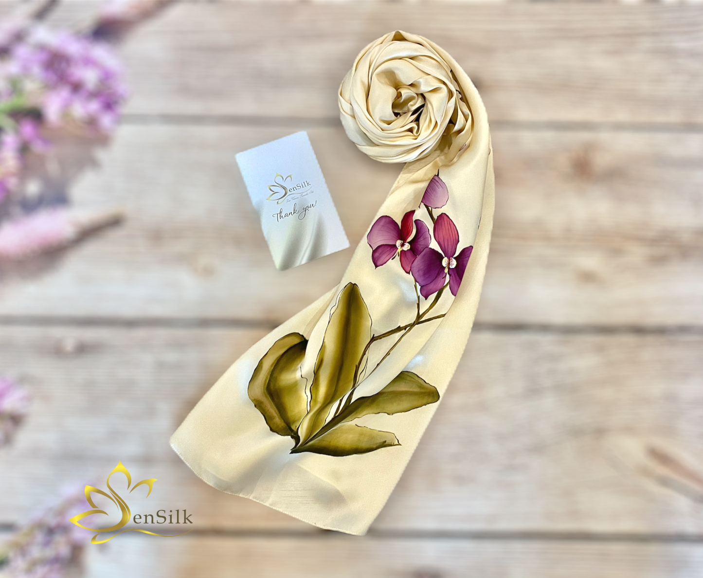 Khăn Lụa Tơ Tằm Vẽ Tay Hoa Lan SenSilk mang sắc đẹp và hương thơm của một loài hoa quý tộc, chúng có đầy đủ sự kiêu sa, đài cát và quý phái của một bậc vương giả! Hoa Lan cũng là món quà tết hết sức ý nghĩa cho các gia đình Việt.