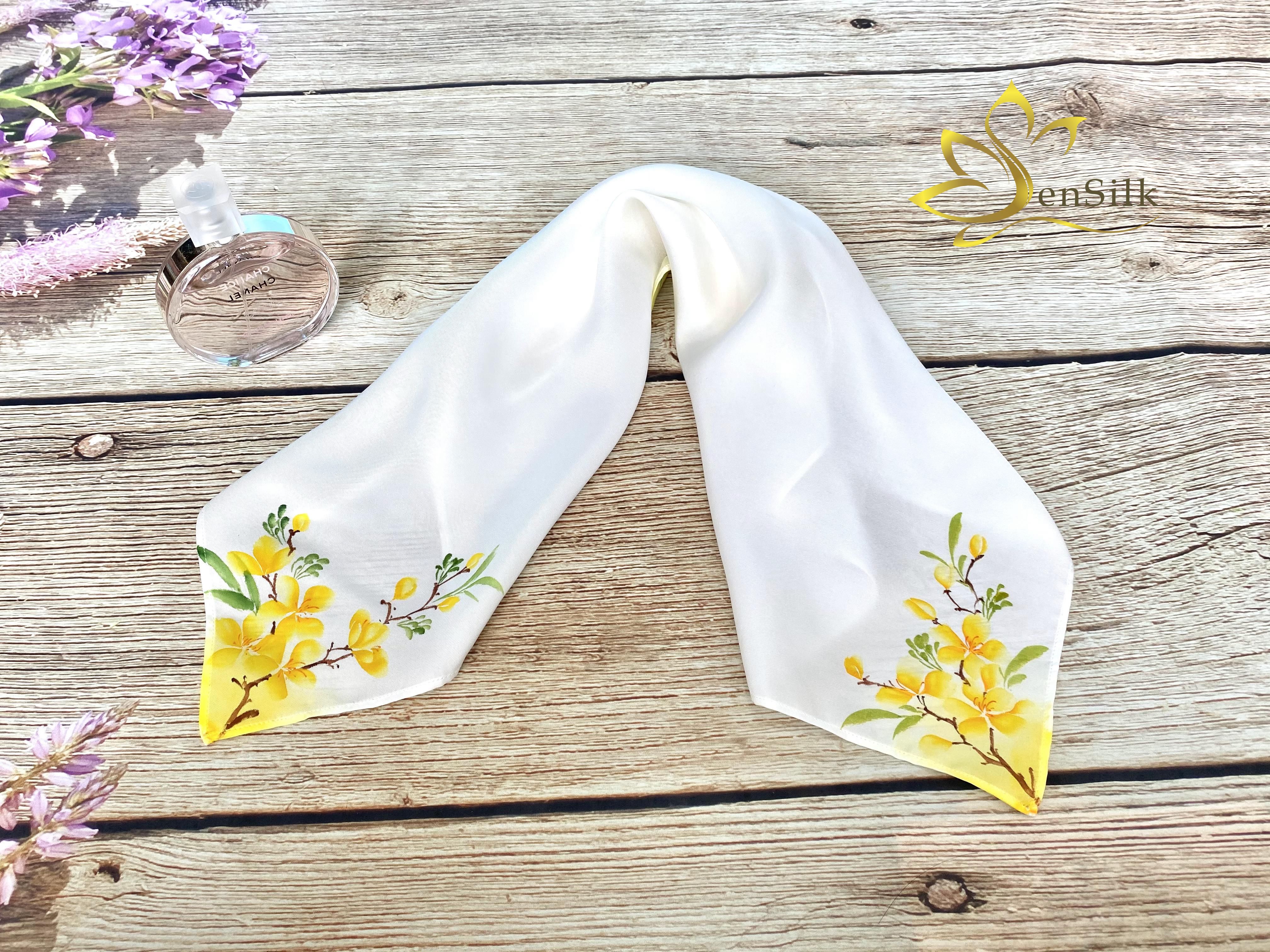Tặng khăn lua vuông vẽ tay hoa Mai là món quà ý nghĩa, không chỉ thể hiện sự nhắc nhớ về một biểu tượng nét đẹp văn hóa Tết, một mỹ tục của người Việt mà còn biểu trưng cho sự may mắn, hạnh phúc, cũng như tình bạn khắng khít trường tồn.