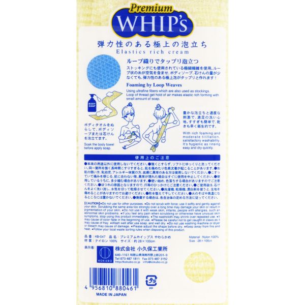 Khăn tắm tạo bọt Whip's Kokubo mềm mịn cao cấp (loại nhiều bọt) - Hàng nội địa Nhật Bản. Chất liệu/Thành phần: Nylon / Polyester mềm mịn, bông xốp với khả năng tạo bọt
