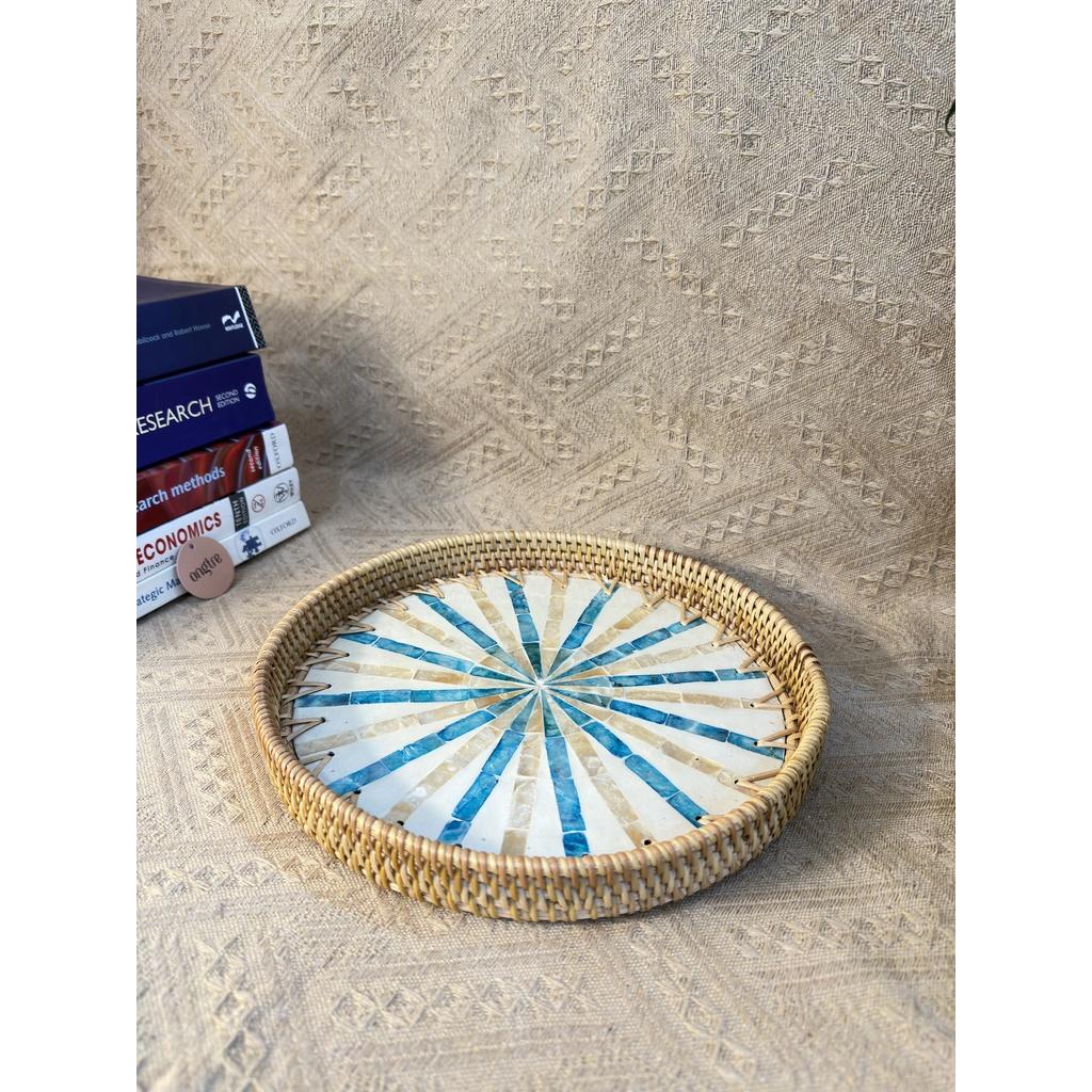 Khay mây tròn khảm trai có tay cầm ONGTRE đựng đồ, trang trí tiệc, decor chụp ảnh sản phẩm - Sản phẩm được làm hoàn toàn thủ công bởi những người thợ có tay nghề