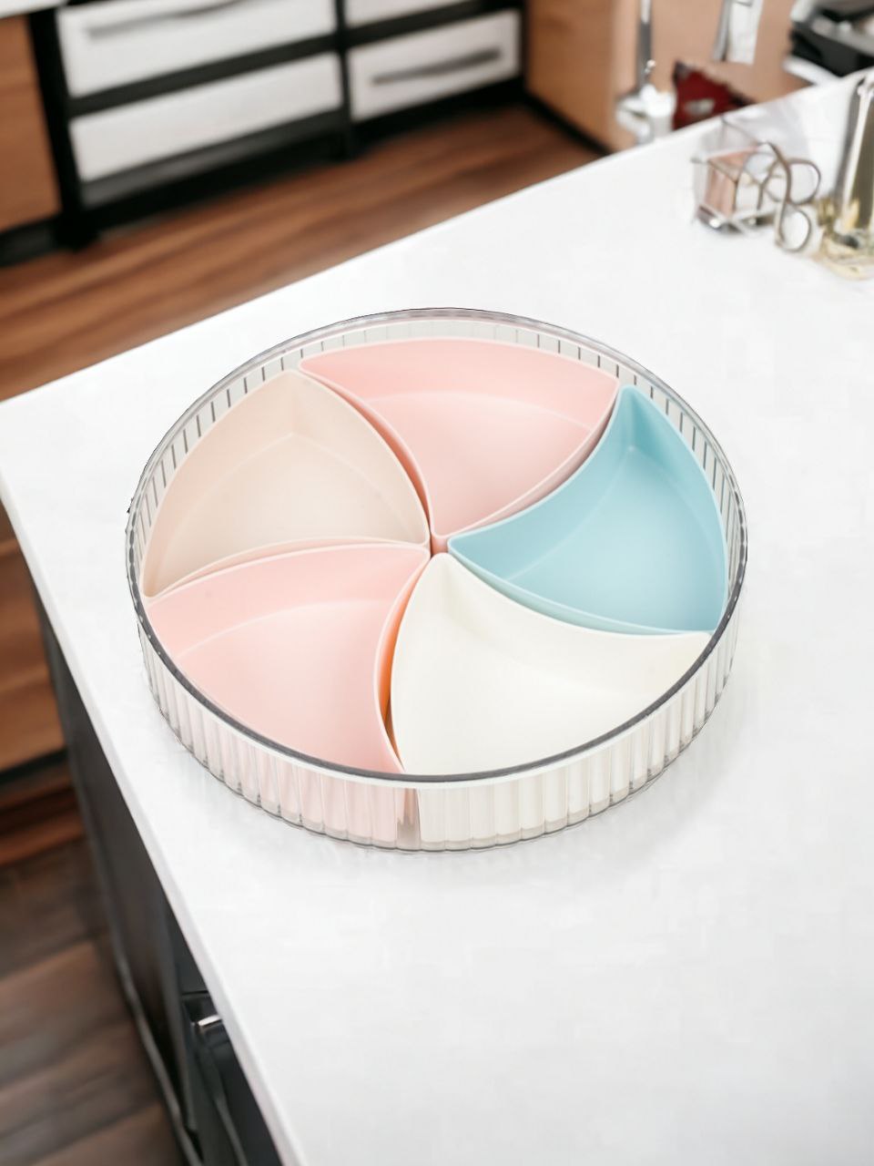 Khay mứt tết. Khay được thiết kế hình tròn biểu tượng trái đất hoàn vũ năm ngăn hình kim cương ngũ lộc