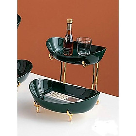 ✨KHAY SỨ ĐỰNG BÁNH KẸO HOA QUẢ HAI TẦNG KHUNG KIM LOẠI MẠ VÀNG CAO CẤP - XANH