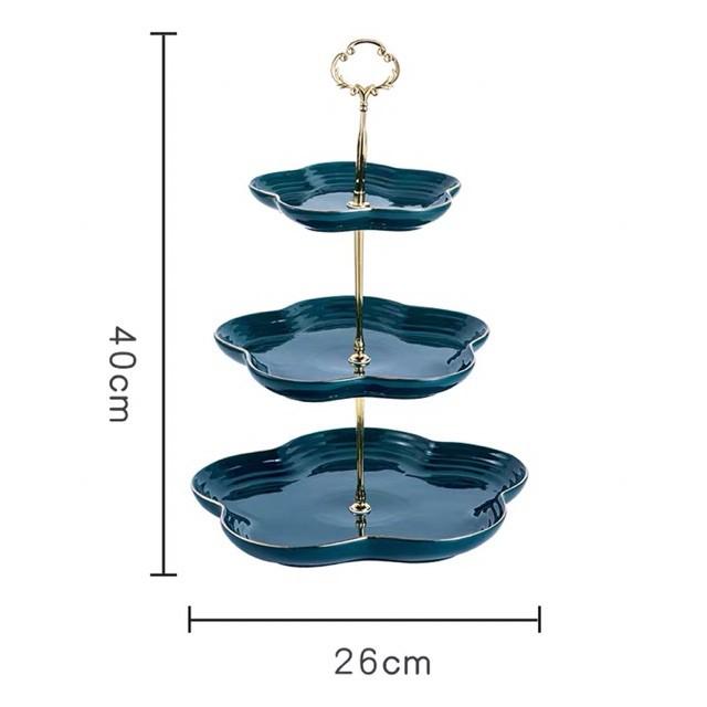 Khay sứ sương 3 tầng xanh cổ vịt đựng bánh, hoa quả gồm 3 đĩa kích thước 25.5 cm, 18.5 cm, 14 cm. Viền màu vàng và khung đều mạmàu vàng cao cấp sang trọng.