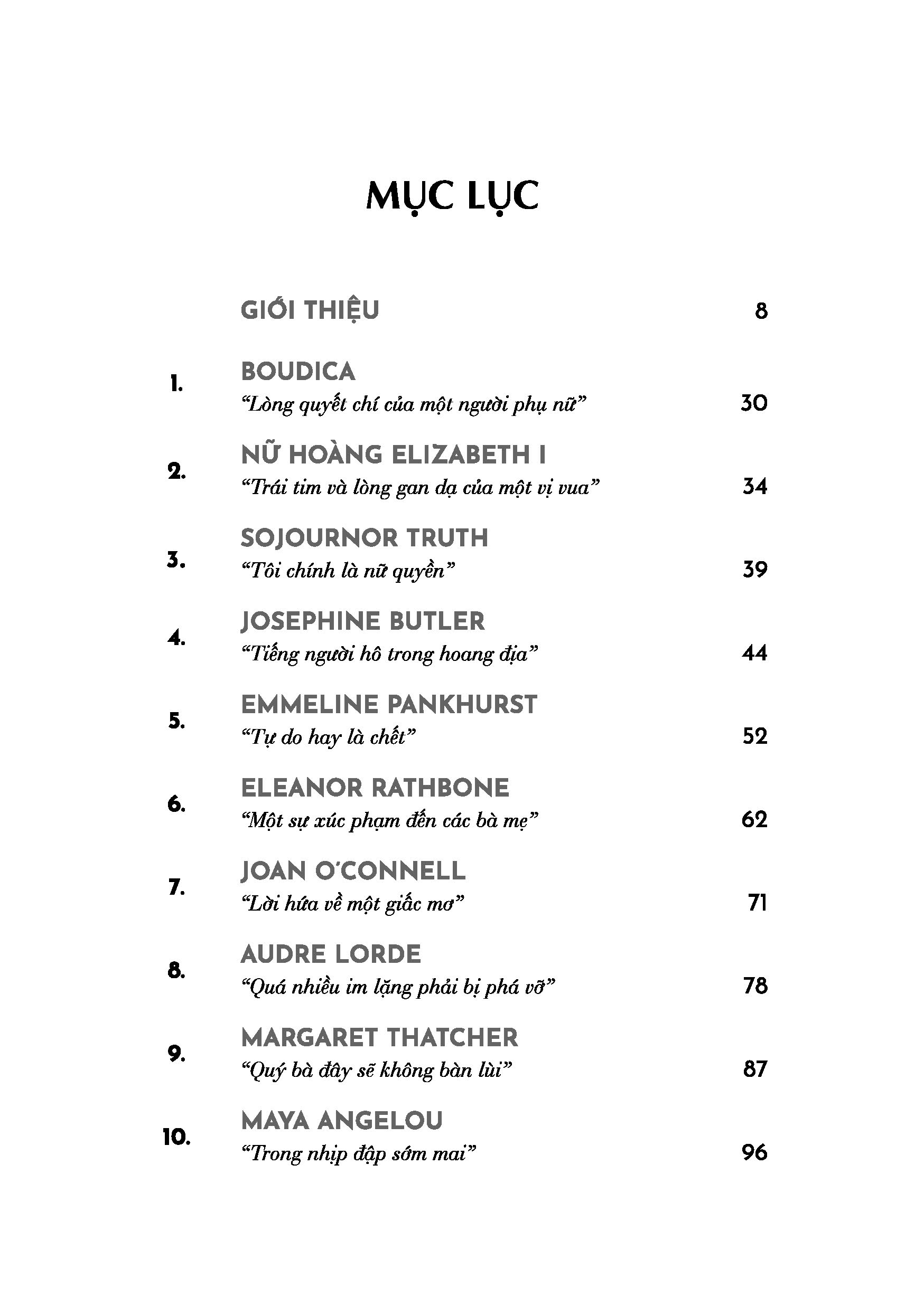 Tên sách: Khi phụ nữ lên tiếng: 35 bài diễn thuyết của những phụ nữ thay đổi thế giới Khi phụ nữ lên tiếng: 35 bài diễn thuyết của những phụ nữ thay đổi thế giới là một tuyển tập bao gồm những bài diễn văn xuất sắc và hợp thời điểm của những phụ nữ đã góp phần làm thay đổi thế giới do chính Yvette Cooper tuyển chọn, trong đó bà đã kể lại những câu chuyện rất xúc động về họ, từ Boudica đến Greta Thunberg, từ Chimamanda Aidchie đến Malala Y Với mỗi bài diễn thuyết, bà đều giới thiệu cặn kẽ, bao gồm bối cảnh lịch sử, tiểu sử nhân vật, nội dung diễn văn, đồng thời còn nêu bật được tính khích lệ và tính thuyết phục mạnh mẽ của mỗi bài diễn thuyết. Qua tuyển tập này, tiếng nói của phụ nữ được truyền đi toàn thế giới, để mọi người hiểu rằng phụ nữ là những cá thể không bị phụ thuộc, họ có tư tưởng độc lập, có chính kiến riêng, có nhân sinh quan độc đáo. Cuốn sách không chỉ lan truyền tiếng nói của phụ nữ, mà còn tôn vinh tiếng nói của họ. Tiếng nói của họ xuất hiện trên khắp thế giới, khắp các thời kì và đề cập đến mọi lĩnh vực. Cuốn sách tập hợp các bài diễn văn của những nữ hoàng chiến binh, những lãnh đạo quốc gia, những thiếu niên và những người hưu trí, những ngôi sao tham gia hoạt động xã hội và những người đấu tranh vì cộng đồng ở địa phương. Các bài diễn thuyết của họ là những lời kêu gọi chiến đấu, những cuộc bút chiến đầy nhiệt huyết và những chiêm nghiệm phản tỉnh. Họ nói về tất cả, từ những vấn đề nóng trên toàn cầu như chiến tranh, biến đổi khí hậu, đến những vấn đề chuyên biệt hơn như như vật lý, mại dâm, nghệ thuật và cái đẹ Qua cuốn sách, chúng ta còn nhận ra một điều: nhiều bài diễn thuyết có thể thay đổi quan điểm và cuộc đời của con người. Tranh biện là huyết mạch của nền dân chủ. Cách ta dùng ngôn từ chứ không phải cách ta vung đao kiếm mới là điều thay đổi được quốc gia. Ngôn từ có thể chữa lành và kêu gọi đoàn kết cộng đồng nhưng cũng có thể châm ngòi cho lòng thù hận và gieo rắc những mầm mống độc hại. Và theo The Independent thì “Cuốn sách này của Cooper không đơn thuần là tuyển tập phản ánh những nhận thức về bất công xã hội; mà nó còn là một lời nhắc nhở khẩn thiết về chính hiện trạng không khí ớn lạnh của bạo lực chính trị nhắm đến phụ nữ phần nhiều.” Được chấp bút sưu tầm bởi một trong những tiếng nói dẫn đầu nước Anh, cuốn sách đã trở thành lời kêu gọi truyền cảm hứng gửi đến toàn cầu để tiếng nói của phụ nữ phải được lắng nghe và chú ý.