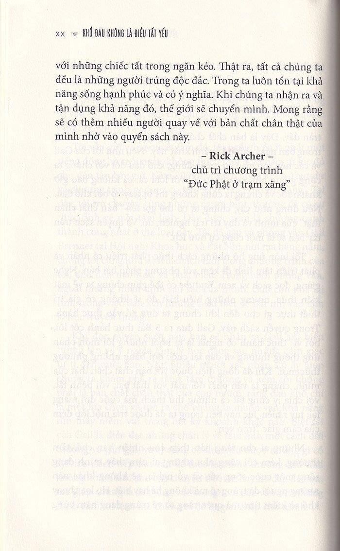- Có hai giáo lý cơ bản trong đạo Phật cũng như trong nhiều trường phái tâm lý học hiện đại: Đau khổ là điều tất yếu và Chúng ta hoàn toàn có thể vượt qua đau khổ. Đối với nhiều người, giáo lý thứ hai dường như là điều bất khả thi. Tuy nhiên, quyển sách Khổ đau không là điều Tất yếu của Gail Brenner sẽ giúp bạn nhận ra rằng, việc thay đổi thái độ khi đối diện với khổ đau trong cuộc sống không phải là một điều xa tầm tay. Bạn hoàn toàn có thể thực hiện được điều đó ngay lập tức. Nếu bạn đang tìm kiếm một con đường tốt hơn để chuyển hóa nỗi đau thì bạn không cần phải đi đâu xa, quyển sách này chính là đáp án dành cho bạn. (Darren Main, tác giả của Yoga và Con đường đô thị huyền bí)