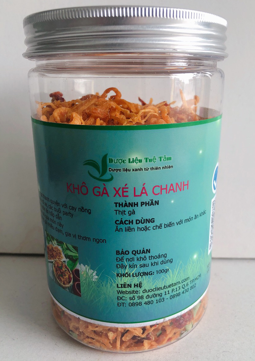 KHÔ GÀ XÉ LÁ CHANH THƯỢNG HẠNG Xuất xứ: Việt Nam. Hạn sử dụng: 12 tháng kể từ ngày sản xuất. Quy cách đóng gói: hủ nhựa pet cao cấp Khô gà xe lá chanh