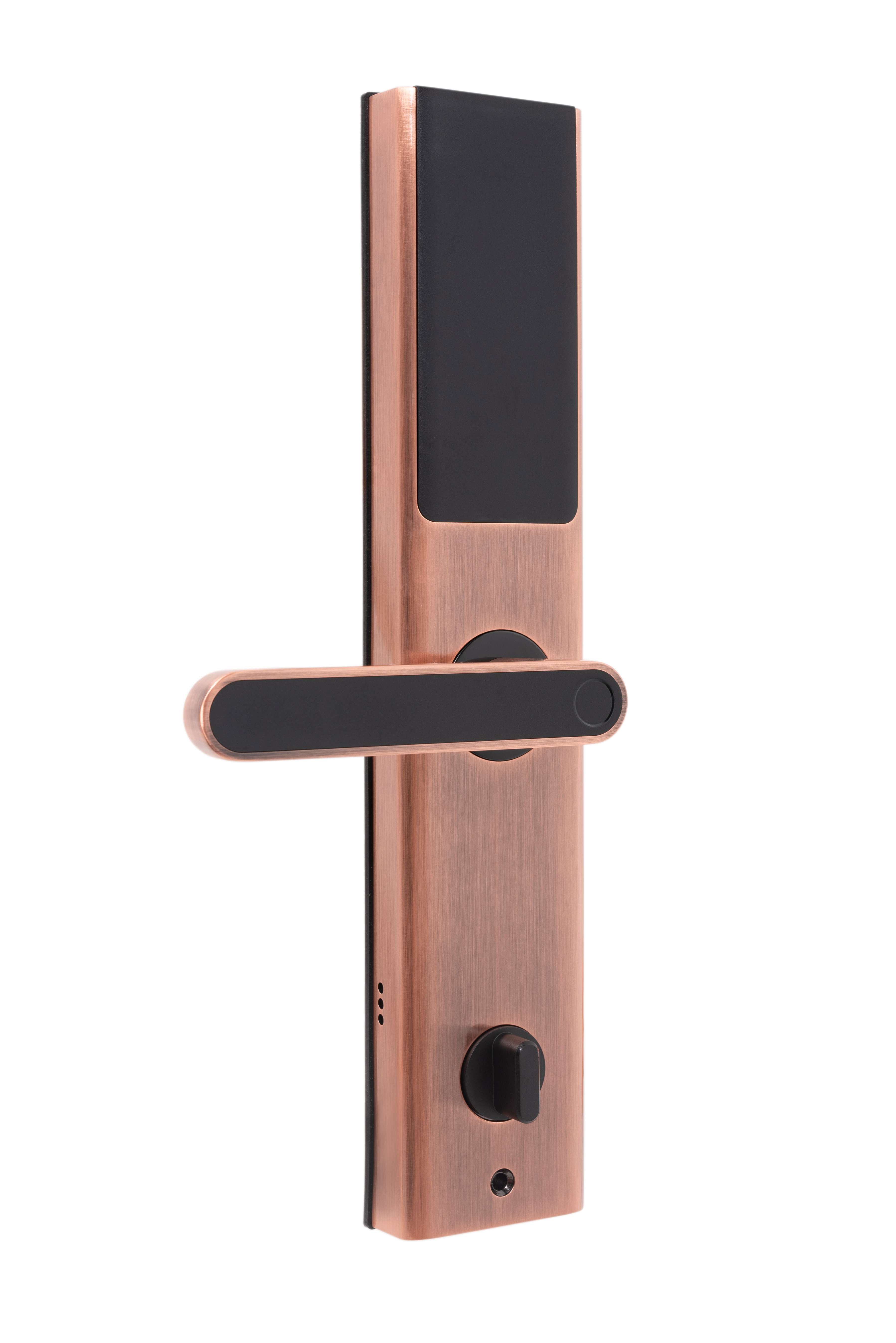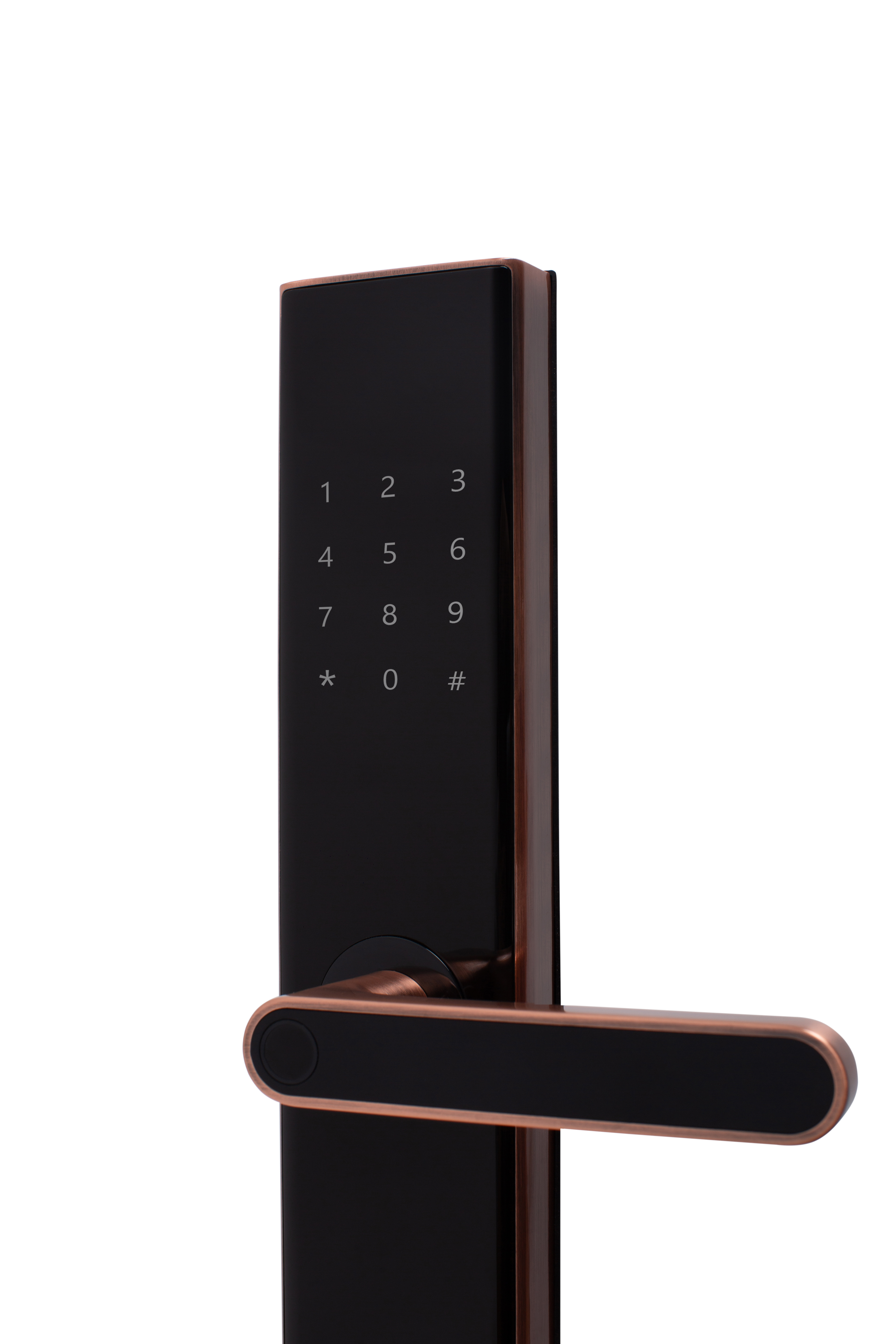 Mặt khóa bằng kính cường lực, vỏ khóa là hợp kim nhôm, tay khóa là hợp kim kẽm được sơn (mạ đồng) chất lượng cao.