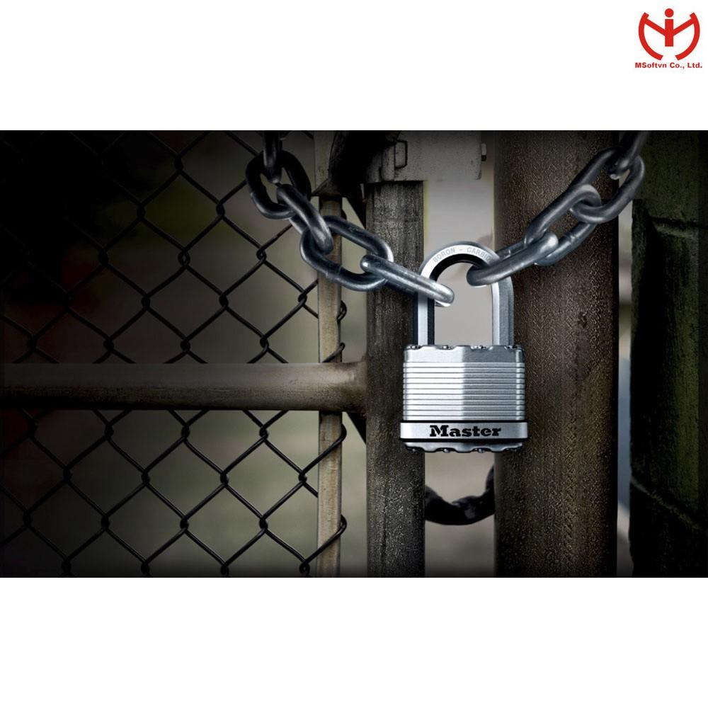 - Thân khóa được bọc lớp kẽm dầy chịu được thời tiết, bên trong gồm nhiều lá thép xếp chồng lên nhau tăng cường khả năng chịu lực của khóa. Bên cạnh đó, khóa thuộc dòng sản phẩm cao cấp Excell của Master Lock, càng khóa được làm từ hợp kim boron siêu cứng.