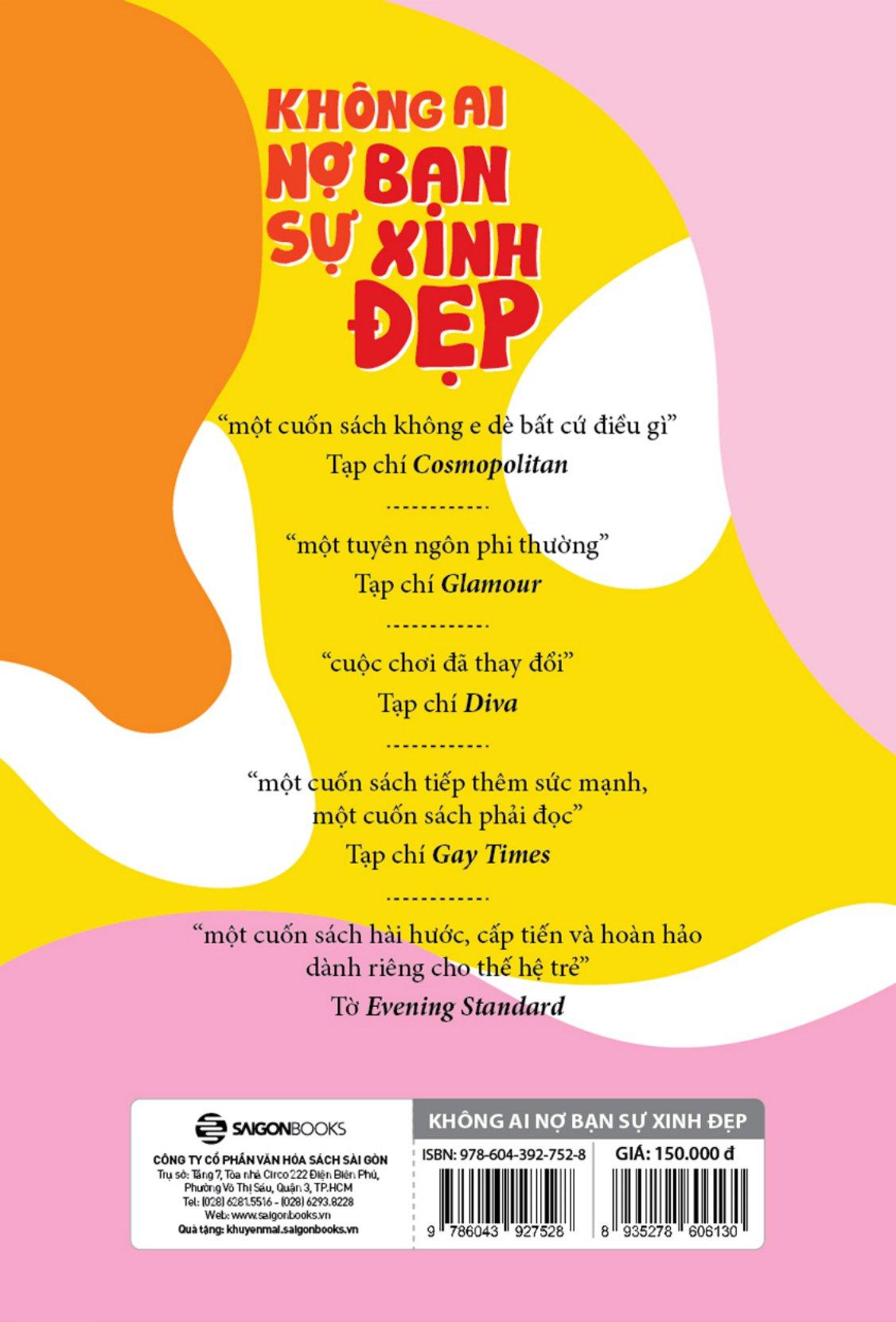 Cuốn sách Không Ai Nợ Bạn Sự Xinh Đẹp mang đến thông điệp yêu lấy bản thân. Nếu tình yêu ấy đủ nhiều và đủ lớn để có thể lấp đầy bạn, bạn sẽ cảm nhận được giá trị của chính m.ình mà không cần bất kỳ mối quan hệ yêu đương nào cả. Thông qua câu chuyện của bản thân, Florence Given sẽ đưa bạn vào một cuộc hành trình suy xét lại tất cả những gì thuộc về m.ình và tự hỏi tại sao bạn lại phải tuân theo những quy ước làm đẹp quá đáng, tốn tiền, tốn thời gian và đôi khi vô cùng đau đớn.